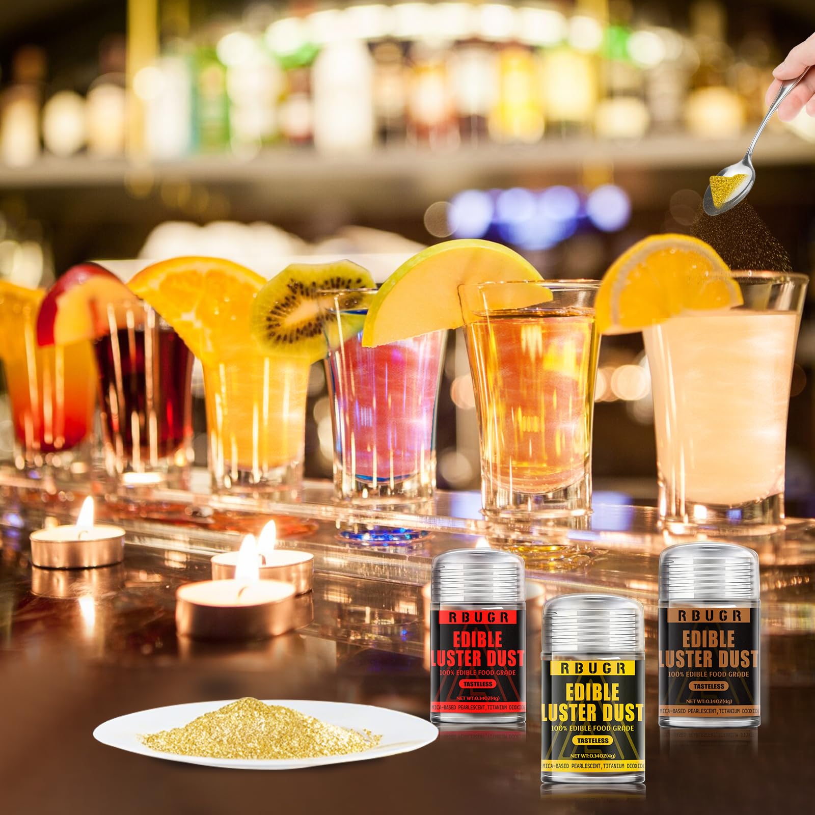 Safe & Vegan: You can be assured that our luster dust edible is safe, as they are made of 100% food-grade luster dust, No allergens, fat free, dairy free, gluten free, nut free, non genetically modified and non-toxic. So whether you are a vegetarian or allergy-prone, you can use these drink glitter without worry. These shimmering glitter are tasteless, will not affect the taste of the food itself. Rbugr food glitter edible dust has excellent adhesion on both wet and dry media