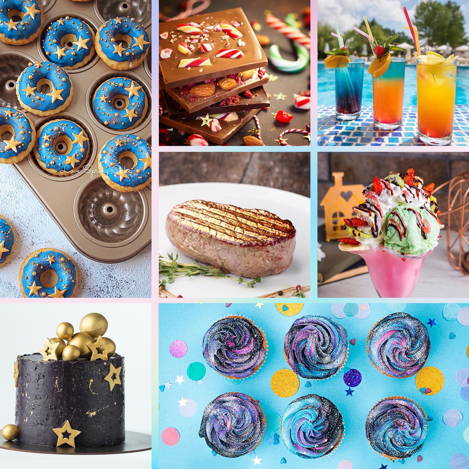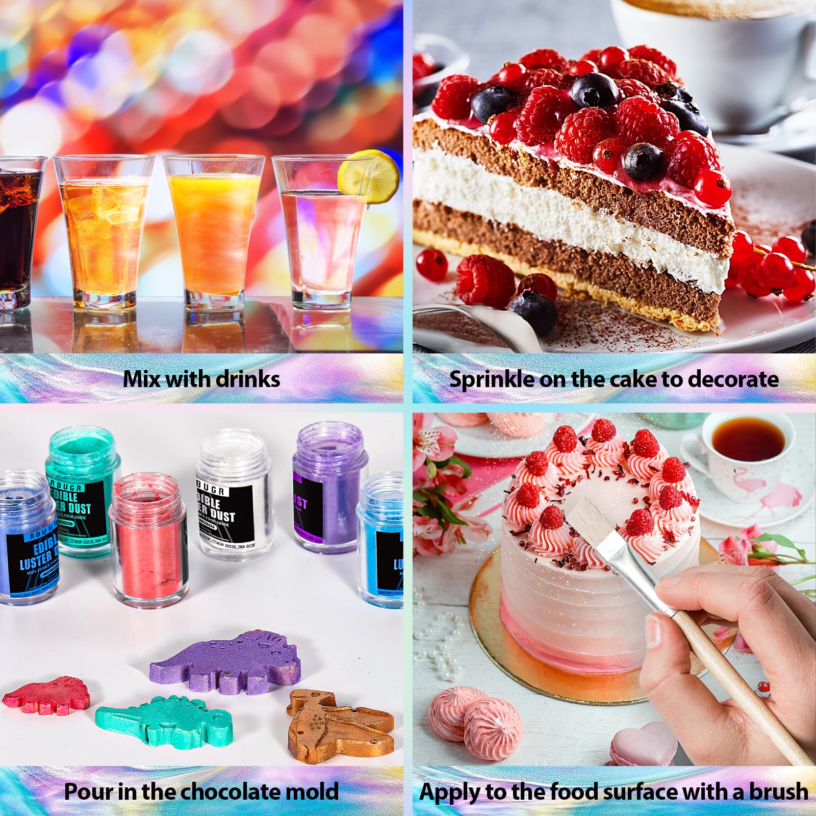 Easy to Use: You can mix the luster dust directly with vodka, cocktails and other beverages to make sparkling starlight drinks; you can dip a brush into the food glitter and apply it evenly on candy popsicles to make lovely patterns; you can apply the edible glitter directly on chocolate grinders to make dazzling chocolates; and you can sprinkle the powder on cupcakes to make beautiful cakes in all colours, etc