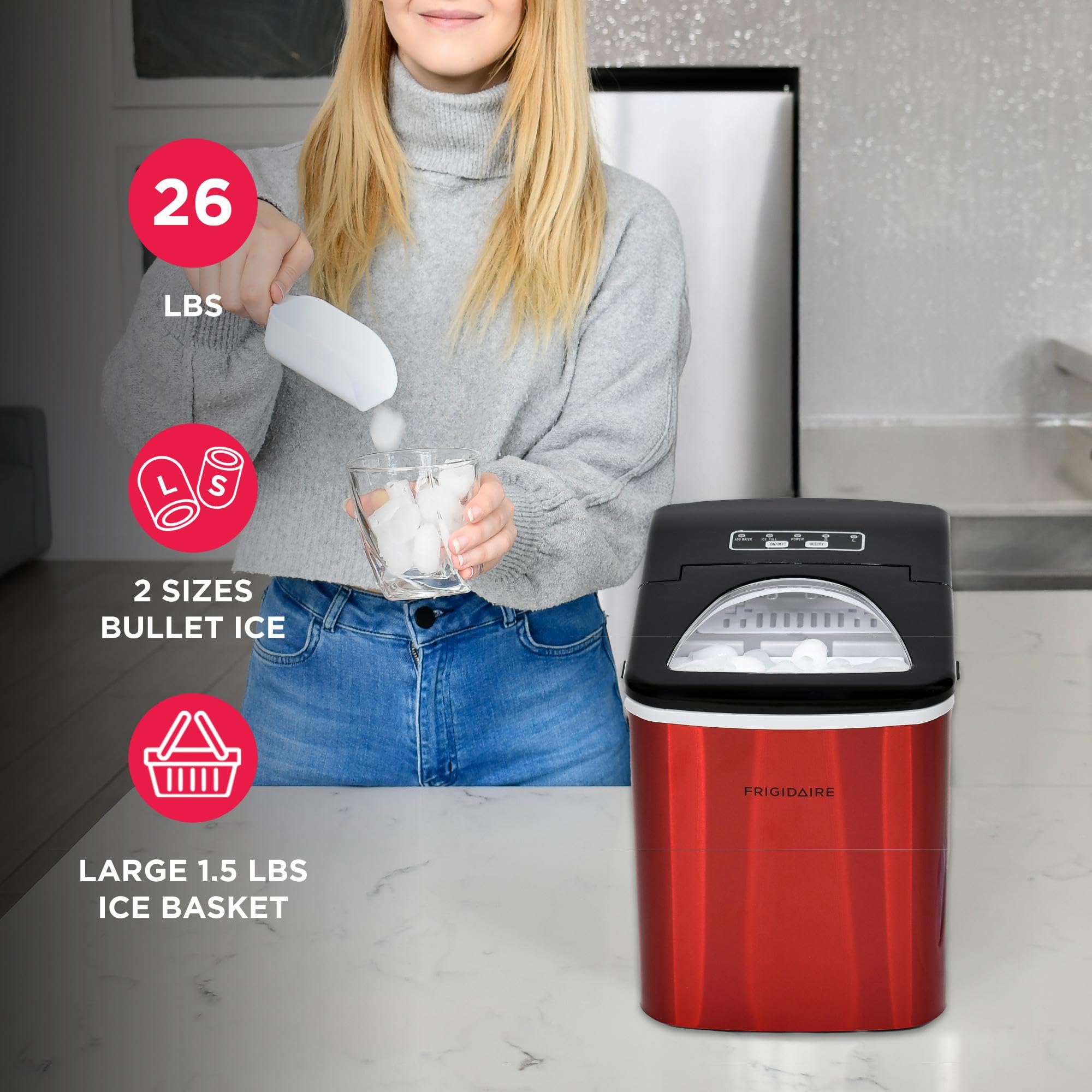 Sleek Design - Never run out of ice again with the Frigidaire Stainless Steel Ice Maker that produces up to 26 lbs. of ice per day. Elevate your space with its sleek stainless steel countertop design that blends seamlessly with any kitchen, bar, office, or dorm.