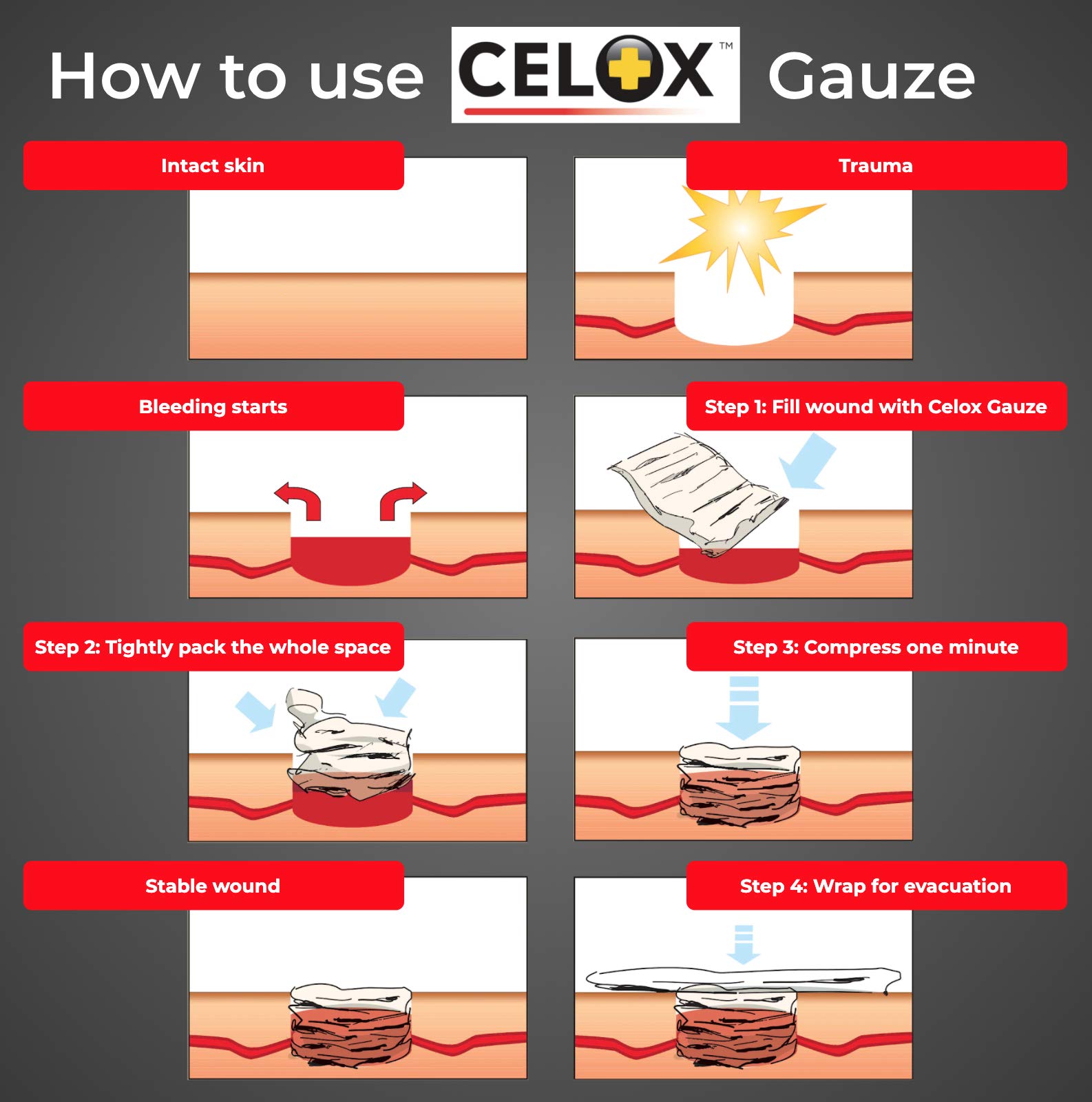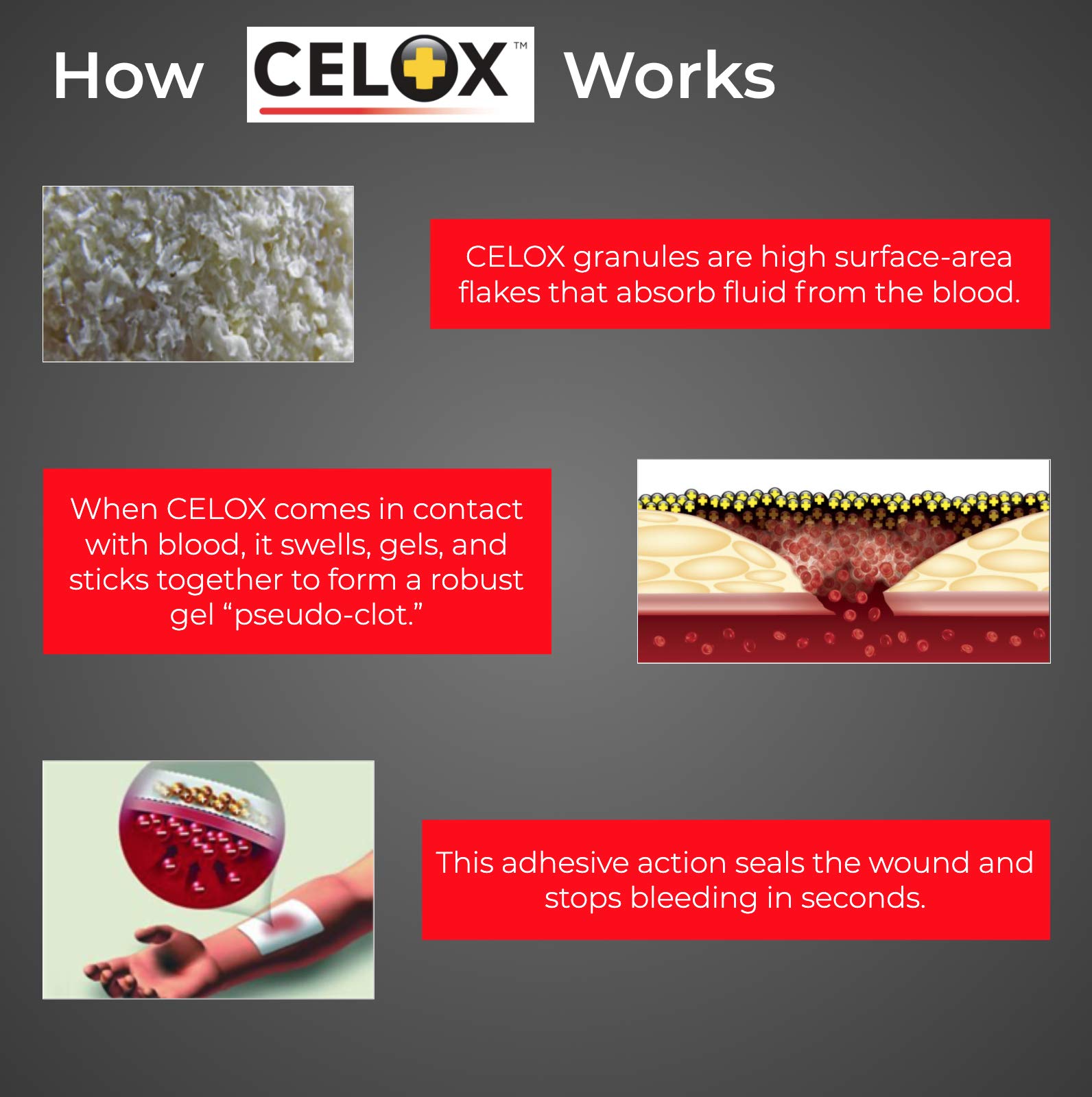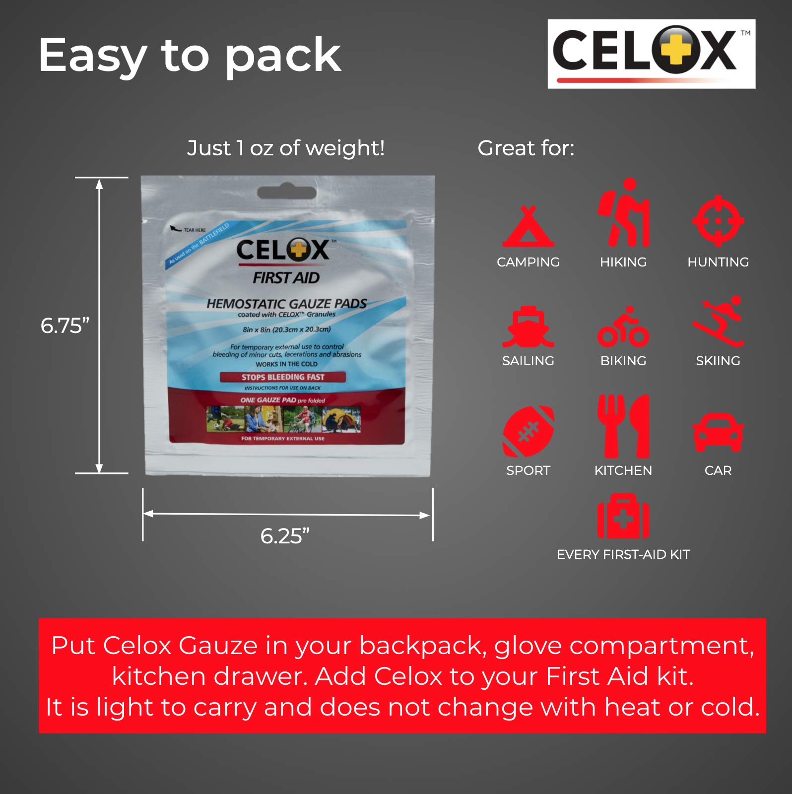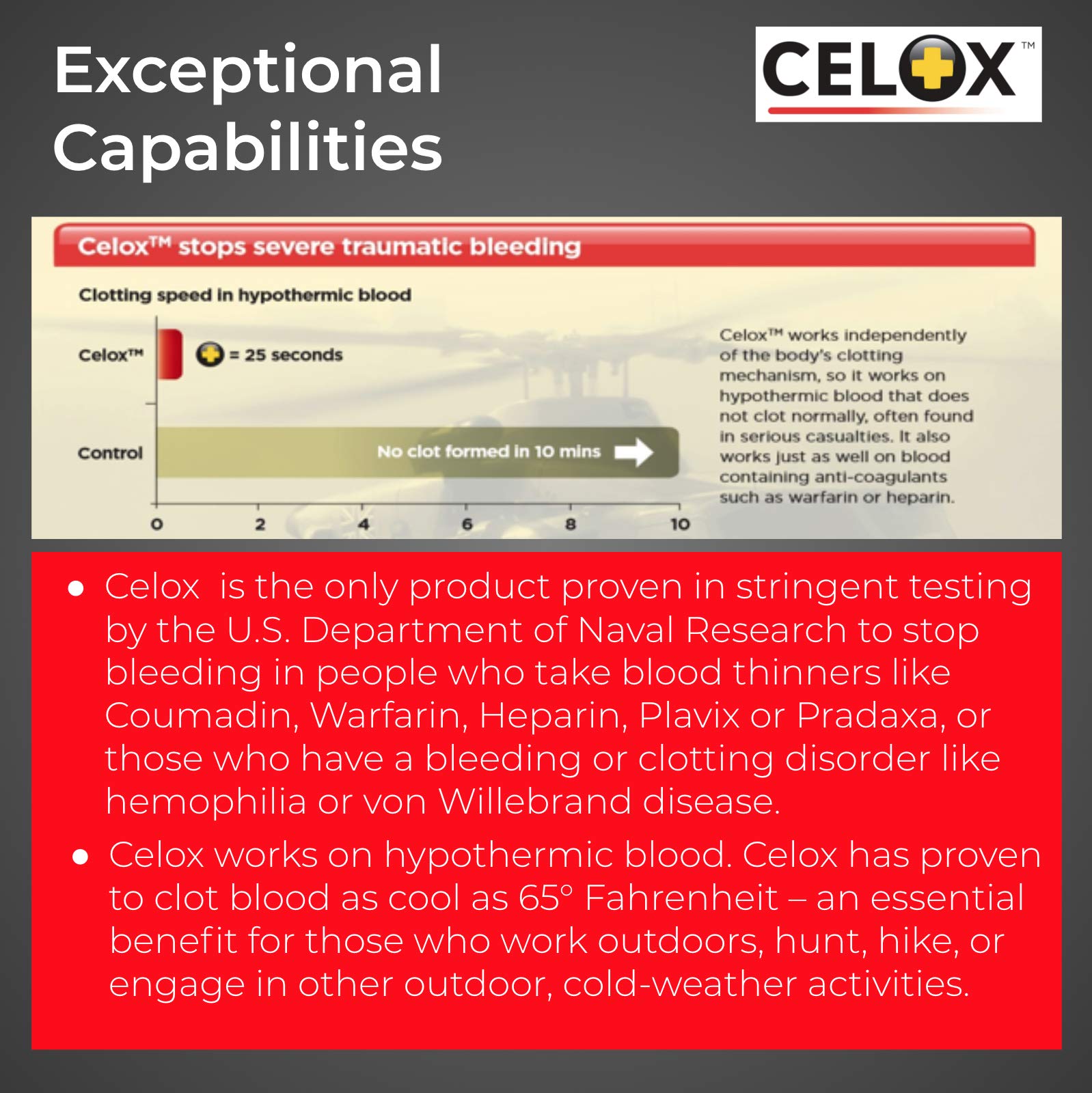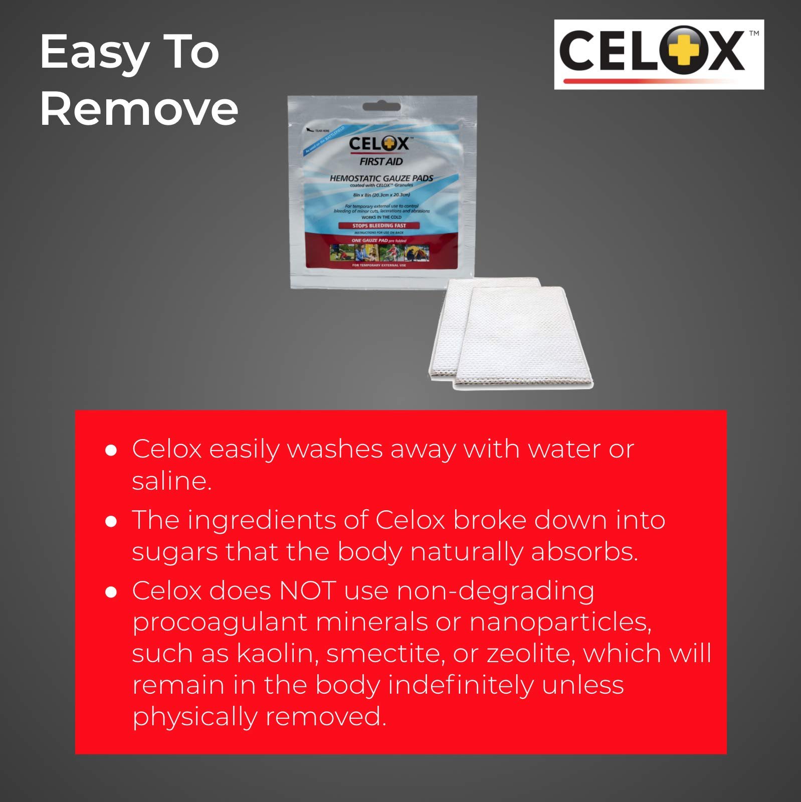Amazon.com CELOX is an over-the-counter blood clotting agent that delivers fast first aid care for all types of bleeding--from cuts, scrapes, and nosebleeds to moderate and severe bleeding. CELOX is so effective, it's been proven to work even in the presence of common anticoagulant blood thinning medications--a welcome breakthrough for the 40 million Americans who are on blood thinners and who can suffer from serious bleeding issues. First Aid Products At a Glance: Potentially life-saving blood-clotting products available for home, work, school, and play Works in the presence of common anticoagulant blood thinners Safe and effective for men, women, children, and older adults Easy to use--even for those without medical training Clots most bleeding in 30 seconds Effectively clots even hypothermic blood Life-saving flakes reduce blood loss. View larger.CELOX--For Peace of Mind Put CELOX in your car, purse, briefcase, gym bag, backpack, tool box, and first aid kit. Have it on hand to provide a safer environment in the kitchen, in the garage, on the playing field, at the campsite, and everywhere you go.Proven to Be Effective Originally developed to assist military medics, CELOX provides fast, effective first aid for men, women, children and older adults, and it's easy to use even if you have no first aid or medical training. CELOX has even been proven to work in the cold (in cases of hypothermia). This potentially life-saving blood clotting agent is available in three convenient formulas: 1. CELOX First Aid Granular Pour directly on a wound and apply pressure--it won't sting or burn. Bleeding typically stops within 30 seconds. 2. CELOX Nosebleed Dressing A small, specially shaped CELOX-bonded pad that can be easily and comfortably inserted in the nostril to quickly stop nosebleeds. 3. CELOX Gauze Pads and CELOX Gauze Roll Pliable gauze bonded with full-strength CELOX granules. How CELOX Works When the active ingredients in CELOX come into contact with blood, they quickly swell, gel, and stop bleeding. CELOX's powerful clotting ingredients work independently of the body's normal clotting processes, and they only gel with the blood they come directly into contact with. CELOX delivers potentially life-saving power as it stops bleeding, reduces blood loss, and in the event of severe bleeding, helps prevent shock. A Must-Have for Every First Aid Kit CELOX First Aid products are easy to carry in your purse, briefcase, backpack, gym bag, glove compartment, tool box, or tackle box. Having CELOX First Aid products on hand instantly makes your workshop, garage, car, boat, or home a safer environment. CELOX empowers people to respond more effectively in any bleeding situation. If a bleeding emergency happens, you'll be ready. CELOX is so effective, it helps treat injuries that require professional medical attention, so you can be proactive until professional help arrives. When every second counts, CELOX puts time on your side. What's in the Box Hemostatic first aid product. Choose from These Life-Saving CELOX First Aid ProductsFirst Aid Temporary Traumatic Wound Treatment, 2 grams (10 pack)First Aid Temporary Traumatic Wound Treatment, 25 gramsNosebleed Dressing (5 pads)Gauze Roll, 5' x 3"Gauze Pad, 8" x 8" Product Description First Aid Only, an Acme United Corporation brand, is the trusted provider of cost effective first aid solutions for individuals and businesses in every industry no matter how big or small. Over the last 150 years, Acme United has acquired the first aid companies Pac-Kit, PhysiciansCare and First Aid Only, to provide the best first aid solutions to our customers.First Aid Only has been helping businesses stay in compliance with federally mandated First Aid and safety regulations since 1988. Based on our years of experience, we make it easy for you to choose the first aid kit that best serves your business needs and number of employees. We offer solutions for single building sites, multi-sites or mobile operations. First Aid Only offers a full line of first aid kits, cabinets, and stations, Emergency Response Care, individual first aid products, Spill Clean Up kits, CPR care and more for all your business and personal safety needs. Our products adhere to OSHA Regulations and ANSI Standards, so you know that what comes in your kit is what is needed. Refill options are also available for replenishing your kit contents, ensuring that your first aid offering is always stocked and ready in case of an emergency. First Aid Only is proud to assemble its first aid kits in the USA. Our just-in-time manufacturing capabilities allow us to guarantee the longest possible shelf life for first aid items. We use quality products to ensure your employees get the proper medical care to maintain a safe work environment and minimize downtime. From the Manufacturer In clinical testing Celox Gauze has repeatedly shown itself to be able to quickly and reliably stop even deep arterial bleeds. Celox Gauze has hig