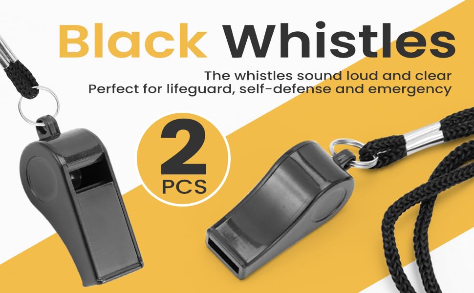 PACKAGE:JKQAGD 2 PCS black plastic whistles with a soft comfortable lanyards.