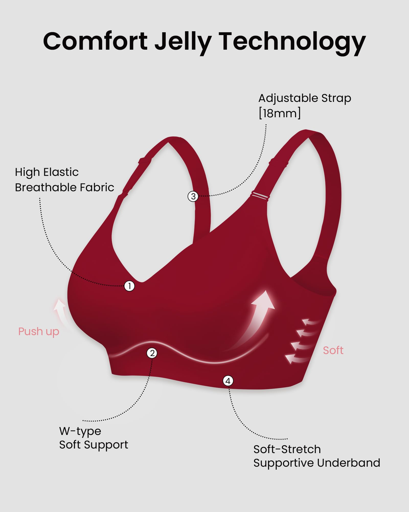 Jelly Wireless Push Up Bras:This Jelly Support Bras for women feature innovative W-shaped "Jelly Bands" and 3D molded cups, paired with a fully seamless construction that fits your body like a second skin. The flattering V-neck cut accentuates natural curves for a subtle push-up effect, while the stitch-free design eliminates friction and irritation. As wireless bras for women, it blends stylish shaping with unrestricted freedom of movement