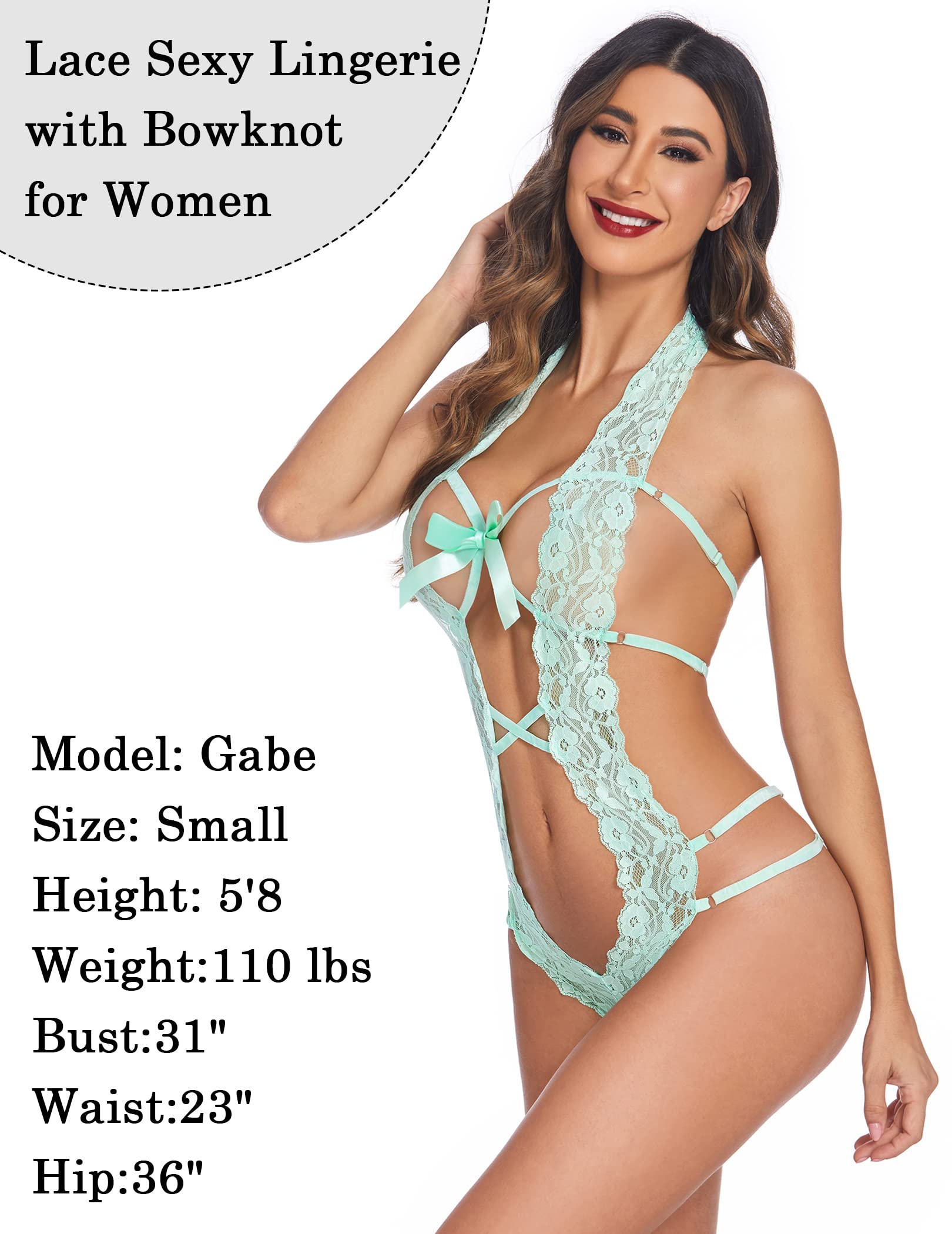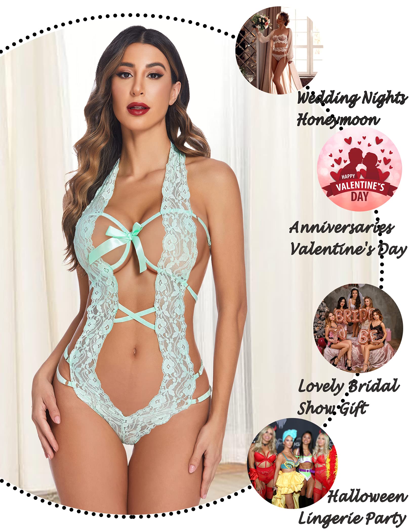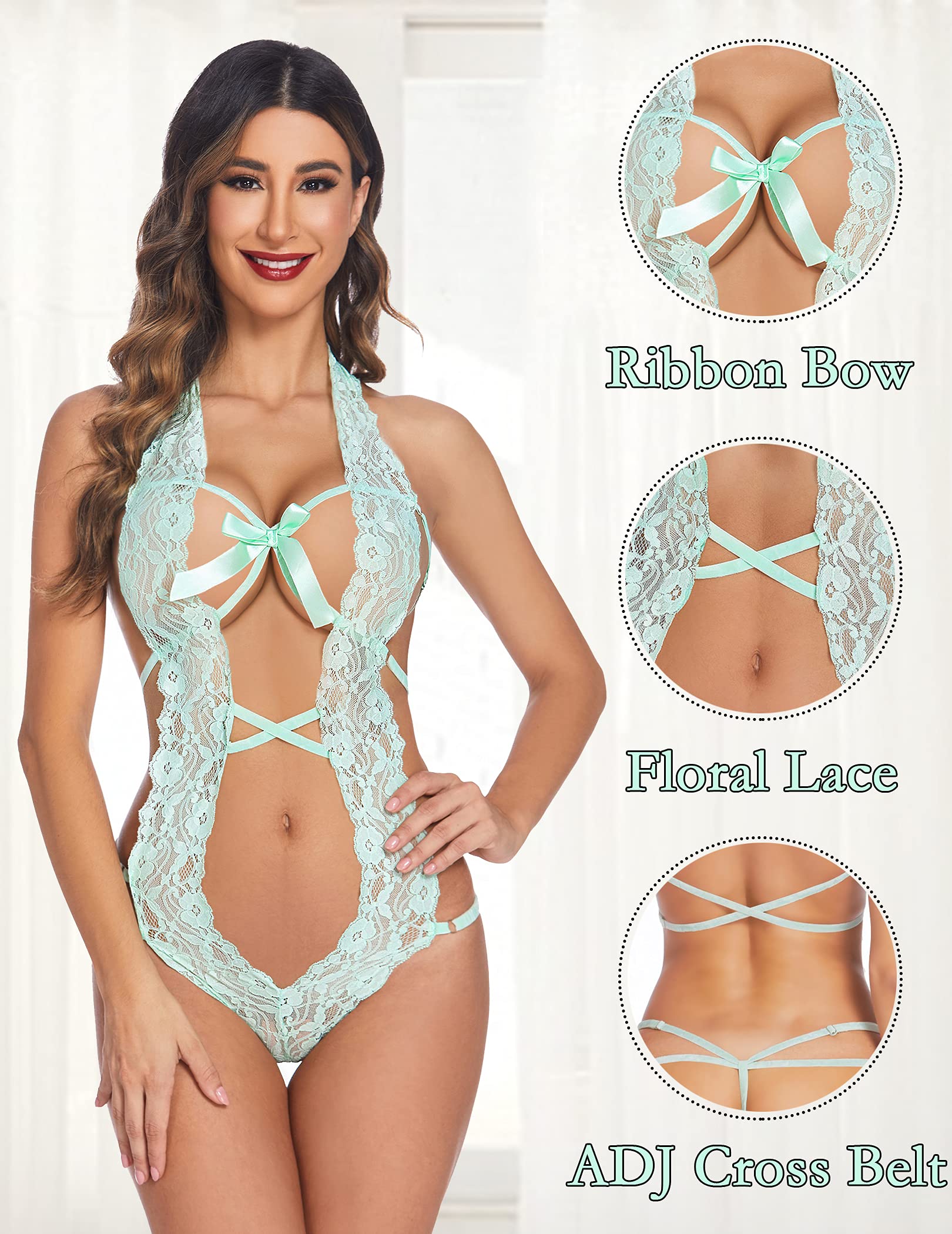 Women's plunging one piece lingerie lace teddies mini bodysuit features halter neck, lace-up front with bow embellishment, adjustable straps, g-string style bottom, and backless design
