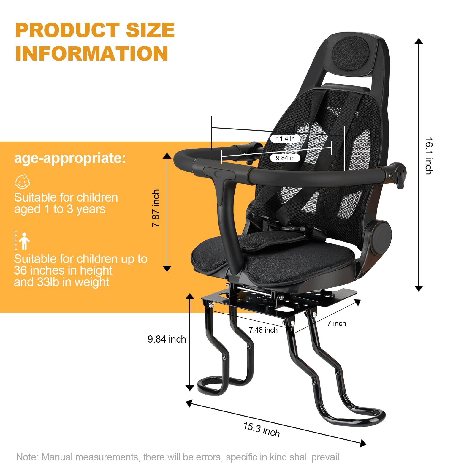 【ADJUSTABLE AND COMFORTABLE】The rear child bike seat has two modes: sitting position and sleeping position; children can ride happily with their parents, and the sitting position allows children to better appreciate the scenery on the road; when children are tired from playing, they can change the seat into a sleeping position to allow children to sleep comfortably;For children ages 1-3 who are less than 36 inches tall and weigh less than 33 pounds