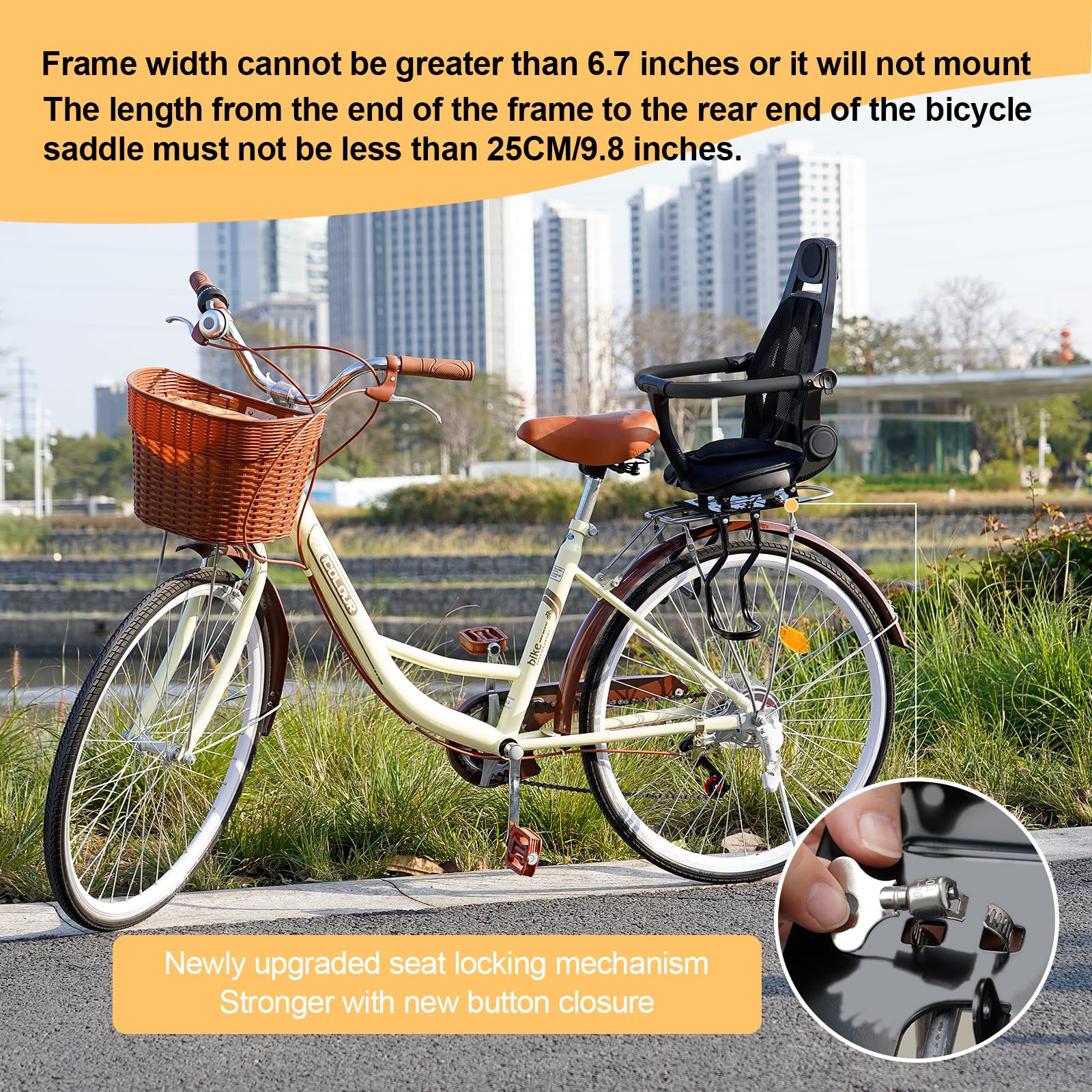 【INSTALLATION REQUIREMENTS】Only a flat bike rack is required for installation. The length from the end of the bike frame to the rear of the bike seat must be greater than 9.8 inches, the width of the bike frame must be less than 6.7 inches, and the thickness cannot exceed 0.5 inches. Please confirm the frame size before purchasing. If you have any questions about the rear seat, please feel free to contact us