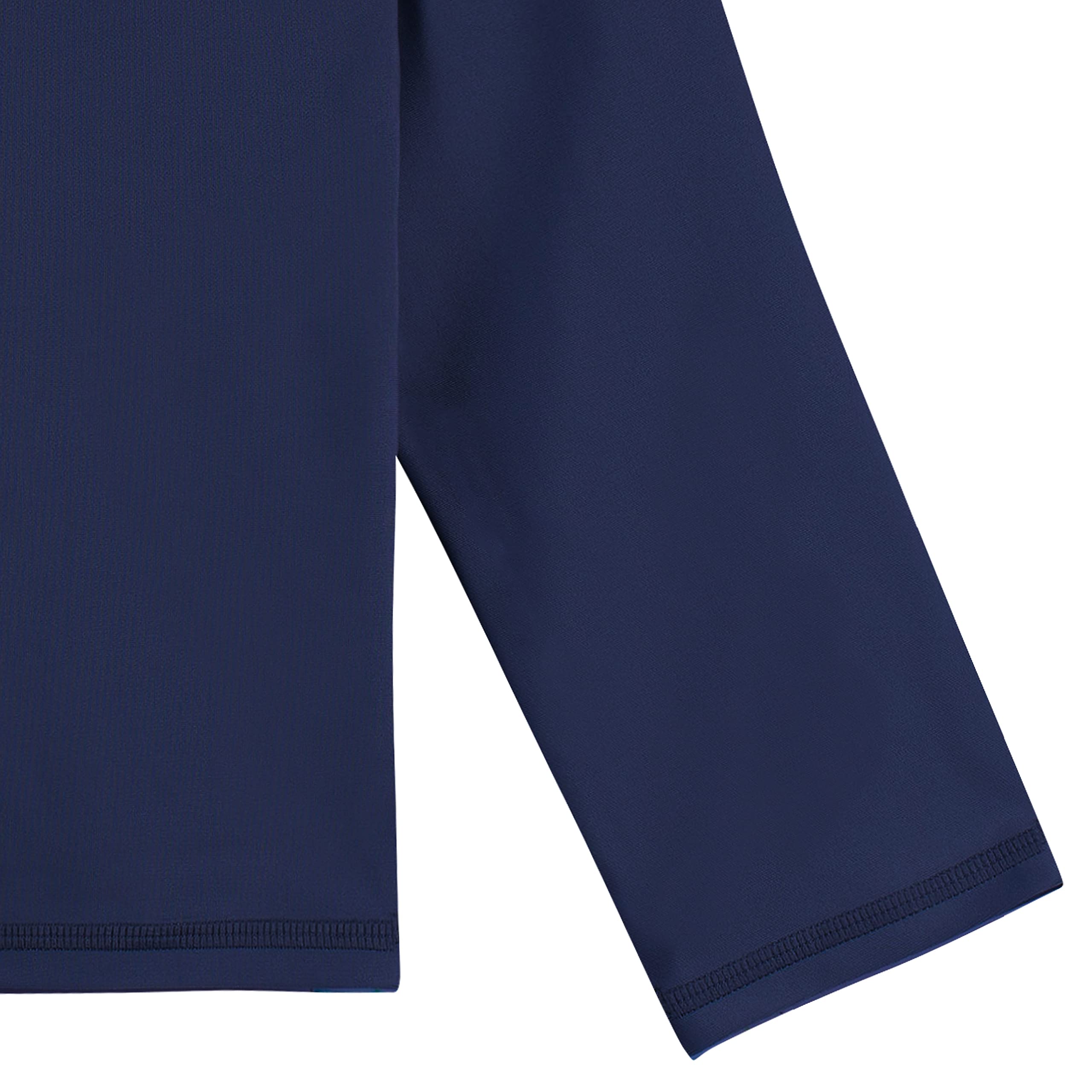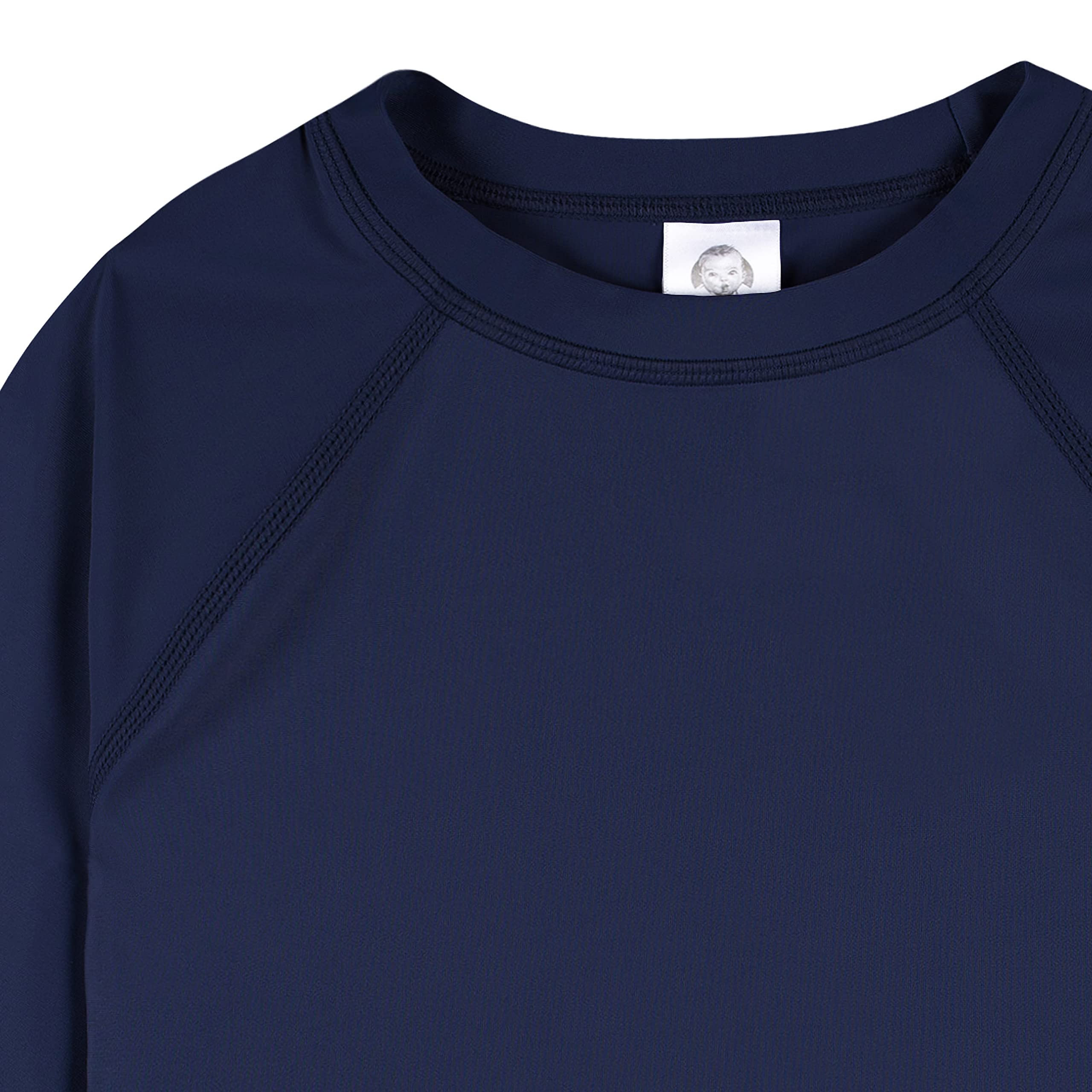 Features UPF 50+ rating on rash guards for great sun protection, comfy crew neck & long sleeves