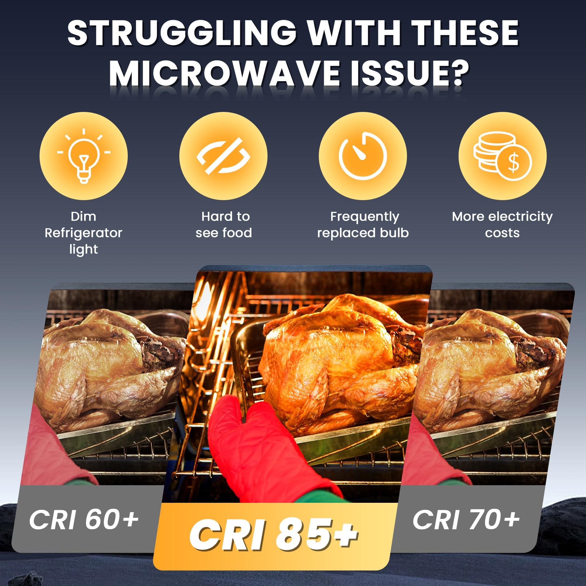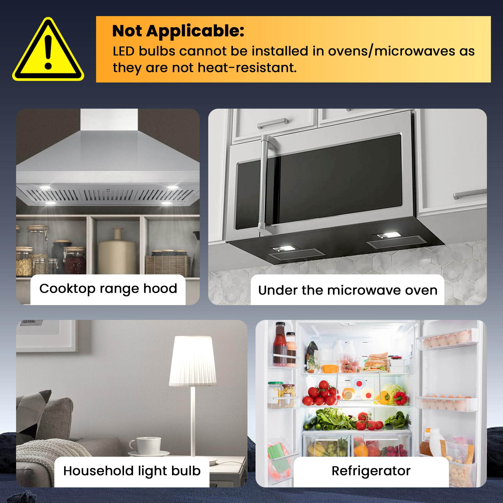 [Caution]: The working temperature range of this LED bulb is -4℉~130℉, this bulb can't be used in the oven, the bulb will melt when the temperature in the oven is over 300℉.Wide compatibility may appear that the LED bulb flickers or fails to turn off, this is normal as there is still a small amount of current in the base to make it work