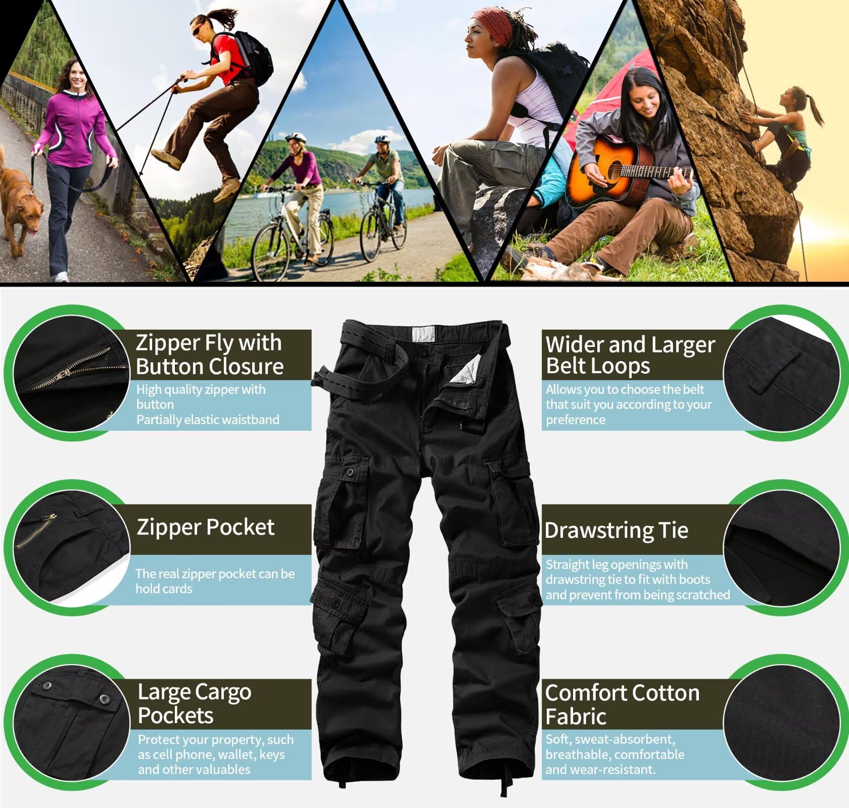 ADJUSTABLE WAISTBAND & BOTTOMS. Camo cargo pants women features breathable and lightweight sturdy twill fabric, soft and comfortable to wear. Hiking pants featuring an adjustable semi waistband and cuffs, these mid-waisted parachute pants provide a customizable fit that ensures both comfort and style. Whether you're trekking uphill or relaxing by the campfire, they move with you. Women cargo pants with pockets are also a good choice for leisure time or games for the cool and fashion design.