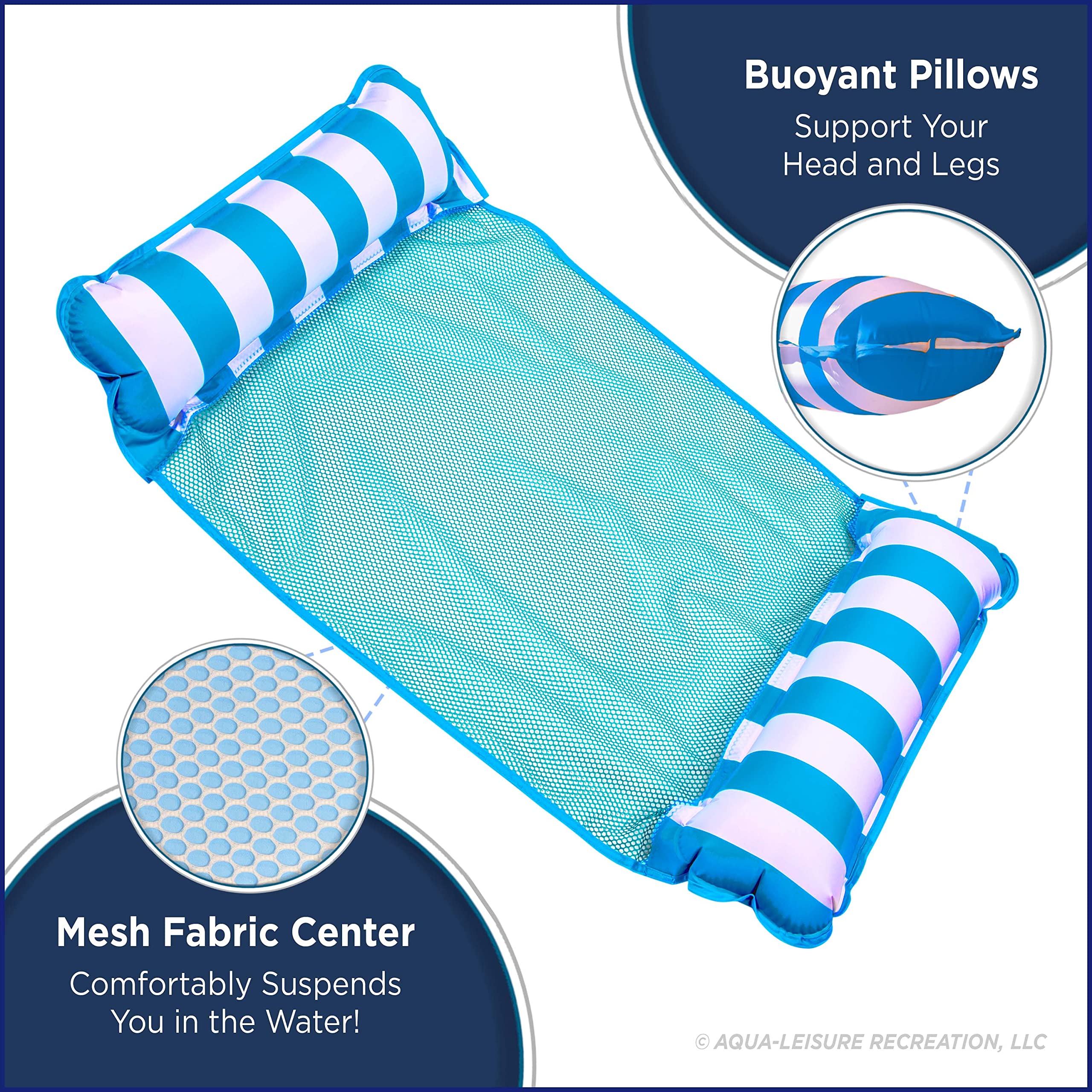 The Monterey boasts a 4-in-1 inflatable float system: hammock, lounge chair, exercise saddle, and Drifter. The Multi-purpose lounge quickly converts for relaxation, socializing, and even exercise in the pool. Lounge features comfortable cool weave fabric and folds easily for portability. Easily inflate and deflate with duo lock inflation system. The Monterey inflatable float system is a great addition to the summer pool this season and delivers fun so you can socialize, relax and even exercise. -Versatile: Monterey 4-in-1 Hammock offers 4 unique positions! Hammock, lounge chair, drifter and exercise saddle. Great for free-motion water (aerobics) exercise. -Recline-Relax-Dream: Supportive mesh lining keeps you cool as you relax on the water’s surface