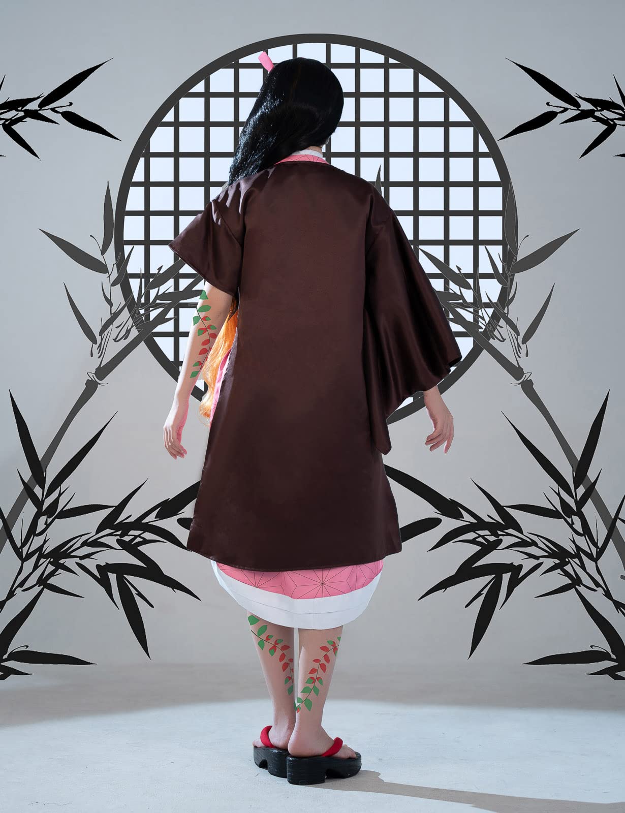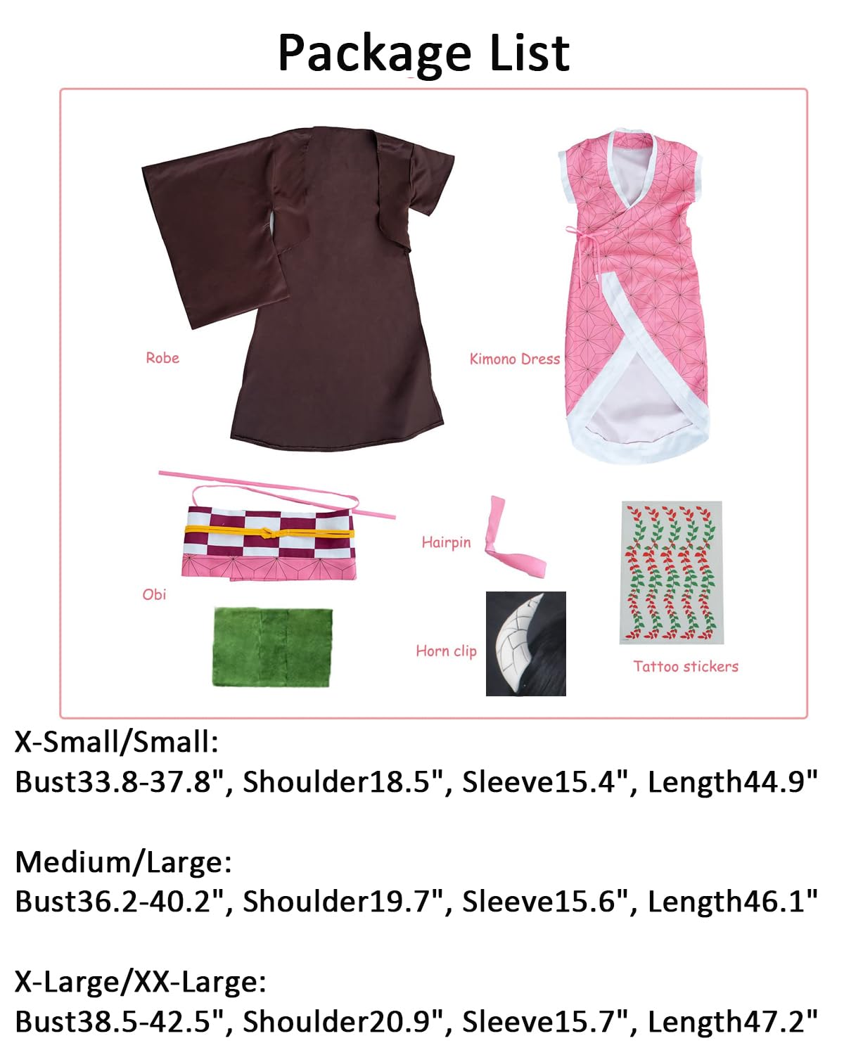 You will Receive -- This nezuko cosplay outfit include a robe, a kimono, a hairpin, a obi, a horn clip, a tattoo stickers