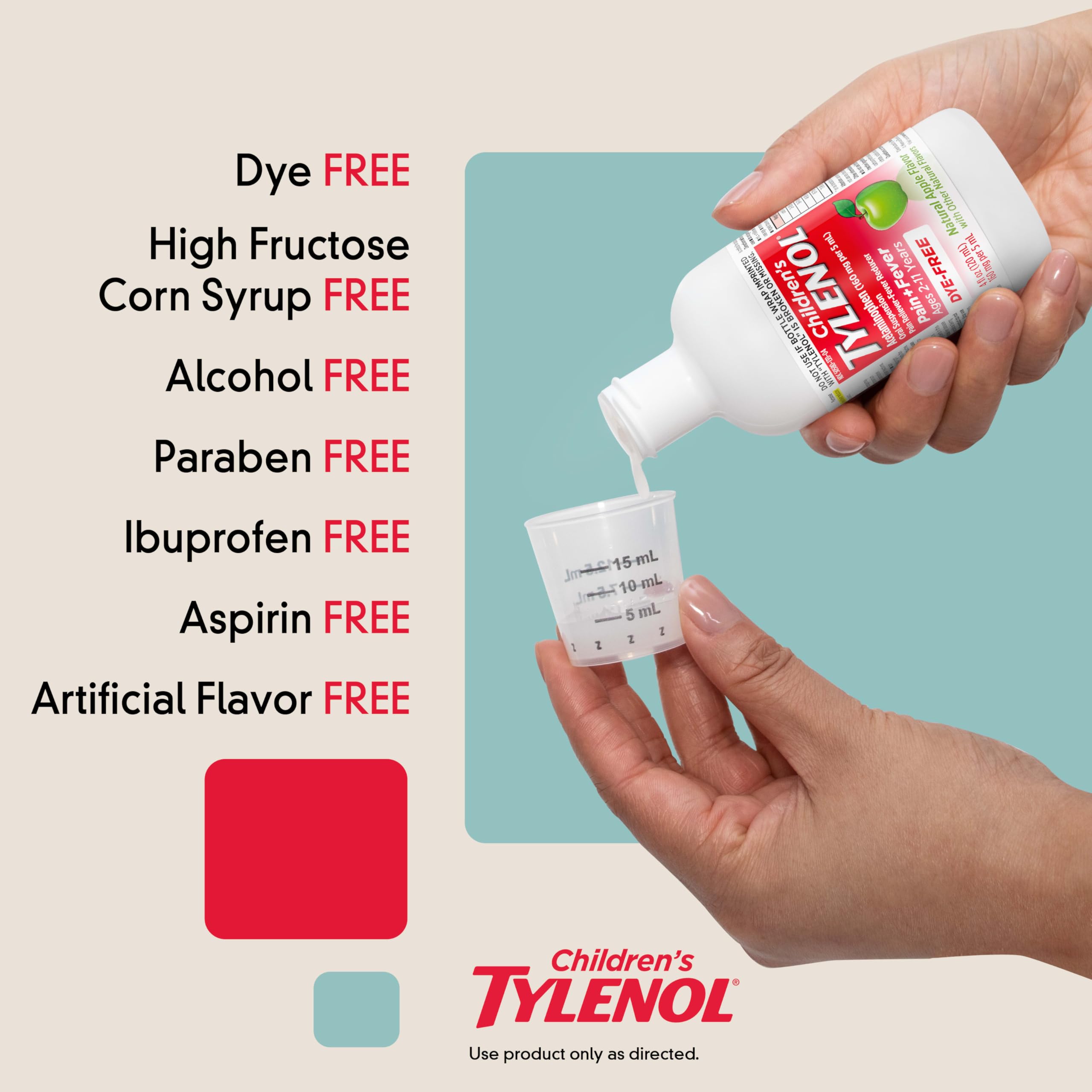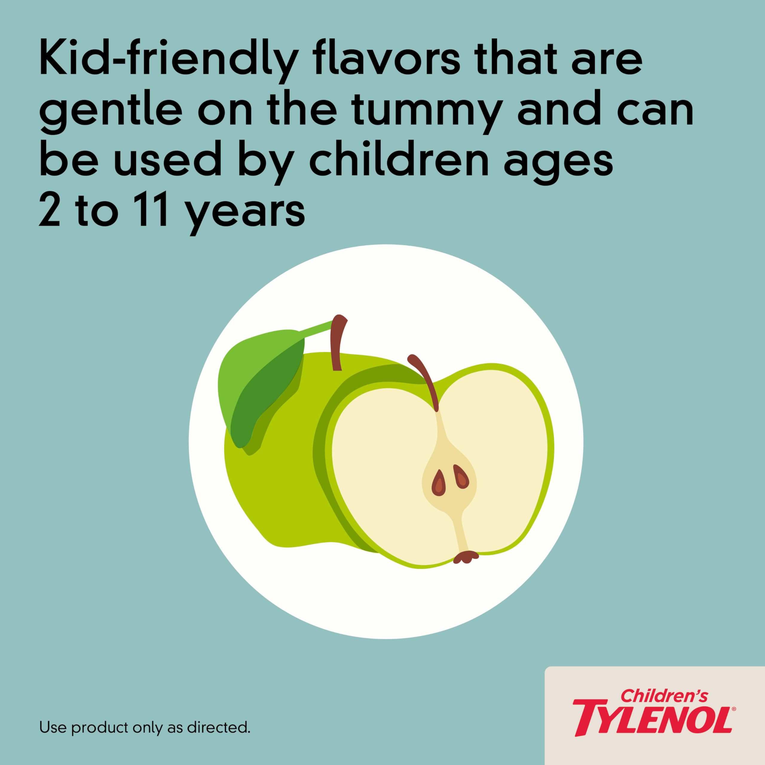 Intended for kids ages 2 to 11 years, Children's Tylenol Liquid Oral Suspension Medicine with Acetaminophen in a Dye-Free Natural Apple flavor (with other natural flavors) provides temporary relief from fever, minor aches & pains, cold & flu symptoms, toothache, headache & sore throat. Each 5- milliliter dose of this kids' liquid pain relief medicine contains 160 milligrams of acetaminophen to temporarily reduce fever & relieve minor aches & pains due to the common cold & flu. It comes in a kid-friendly dye-free Natural Apple flavor & is free from artificial flavoring, high fructose corn syrup, ibuprofen, aspirin, parabens & alcohol, & is gentle on the tummy. From the #1 pediatrician recommended brand for pain & fever relief, Children's Tylenol starts to reduce fever in as little as 15 minutes, so you both can get the rest you need. Parents & doctors have turned to Children's Tylenol for over 60 years for safe & effective children's pain & fever relief when used as directed.