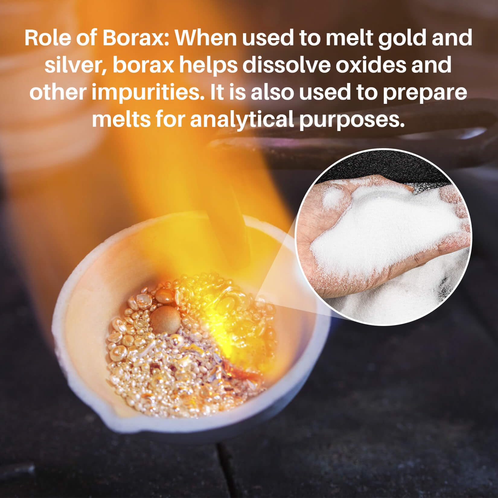 Dissolves Oxides and Impurities: When used in the melting process of metals such as gold and silver, borax effectively dissolves oxides and other impurities. This action results in the formation of a fluid borate slag which floats on top of the molten metal, allowing for easier separation and ensuring the purity of the final product.
