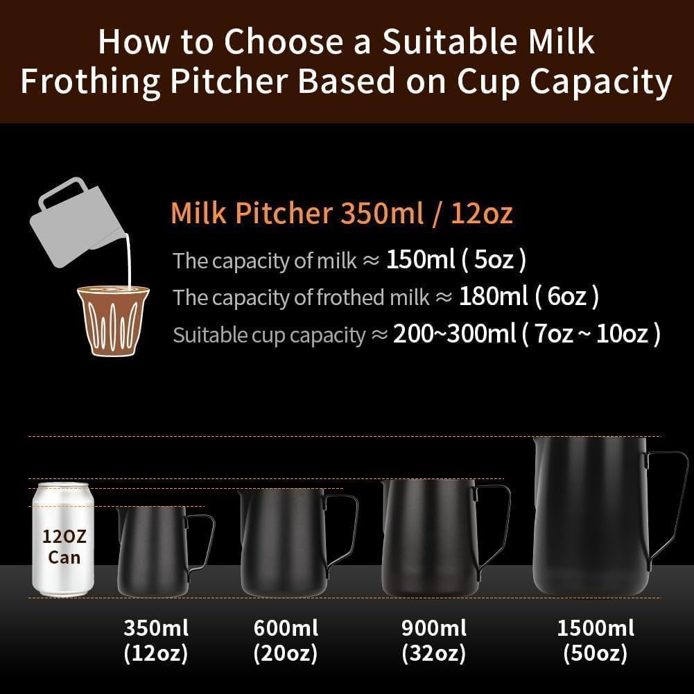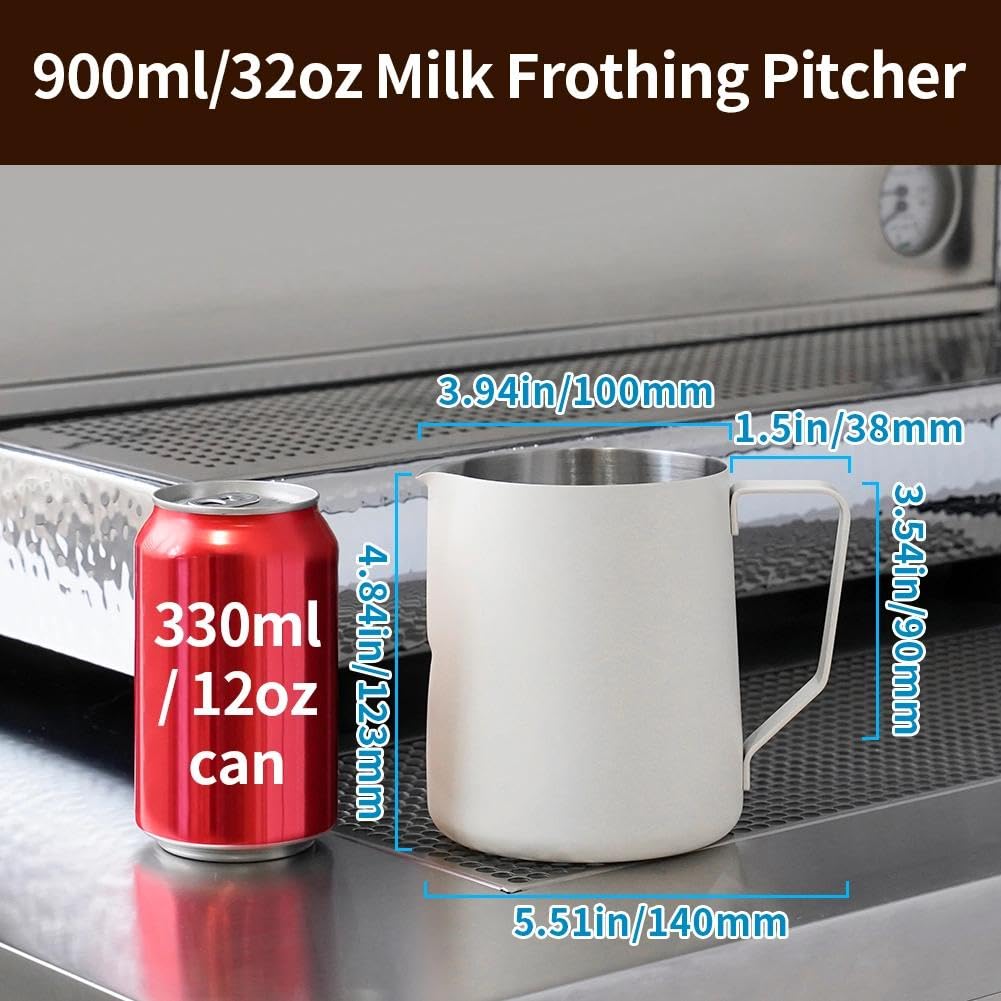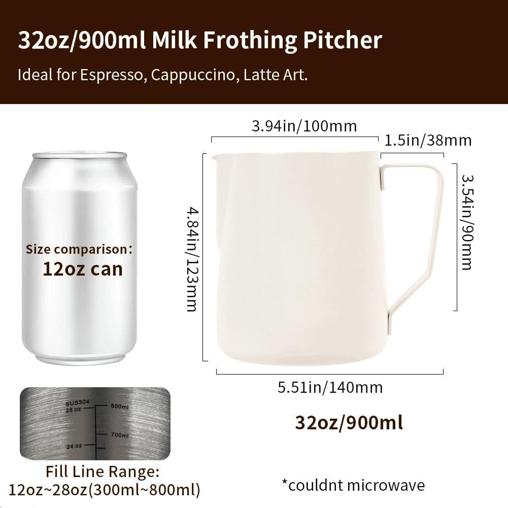 INSIDE SCALE LINES MEASURING: The milk pitcher has clear inside measurement lines(ml/oz), making it easier to control the amount of milk or cream per cup of coffee. 31oz milk frother pitcher can satisfied your different demands. Ideal for foaming or steaming milk, used in espresso and cappuccinos, it can be used for any liquid measuring like water, juices, batter mixes, smoothies etc.