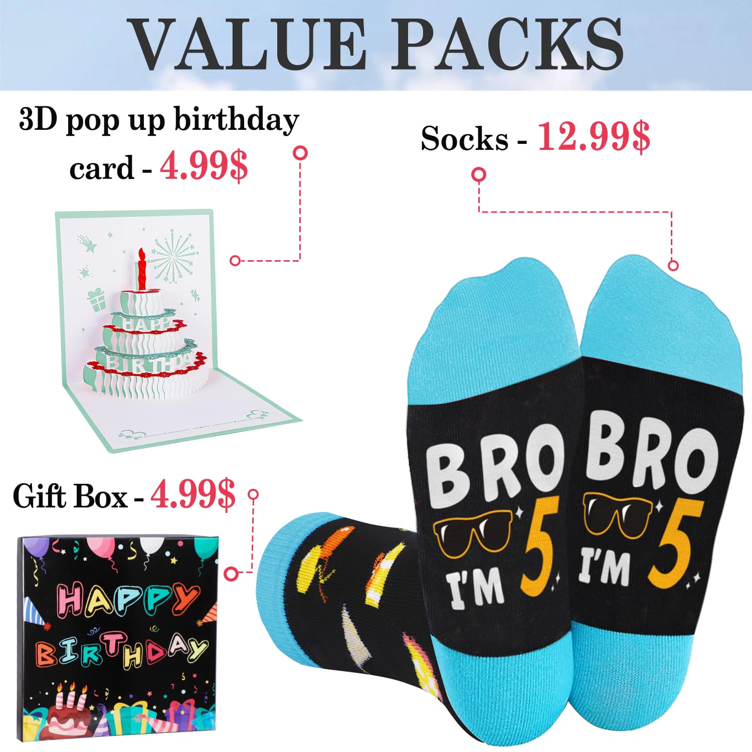 Socks for 5th Birthday Boys Design: Our socks are predominantly black, blue, orange and white, eature birthday gifts, balloons, cakes, and other birthday elements on the top, while the bottom is sewn with a hilarious hidden message: "BRO I'M 5." the young and energetic design, Suitable for 5th Birthday Gifts, Christmas Gifts, New Years Gifts or White Elephant Gifts