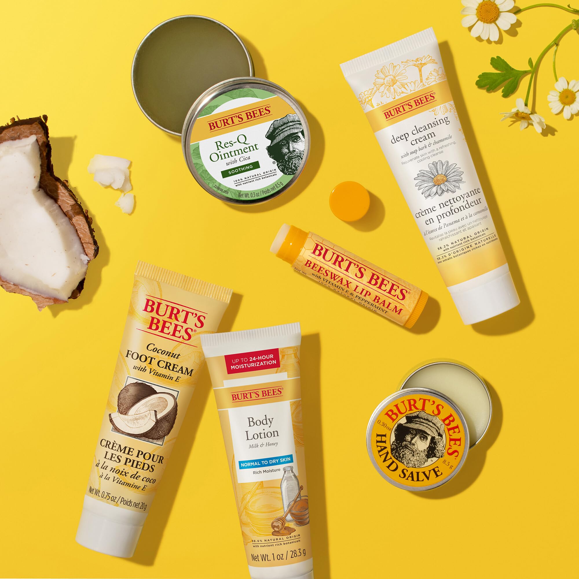 You cant beat a classic or a collection of them, in travel-ready sizes that can go wherever you do! This gift set features time-honored Burts Bees favorites that nourish the skin for effortless skin care. Bring the spa to your home with Coconut Foot Cream that pampers and soothes dry, neglected feet with a rich, naturally moisturizing formula. Milk & Honey Body Lotion has a non-greasy formula and features 98.6% natural origin ingredients like milk, honey, vitamin E, coconut and grapeseed oil. Soap Bark & Chamomile Deep Cleansing Cream is a 99% natural origin face wash that is non-irritating and gentle enough for daily use. Formulated with comfrey allantoin to comfort skin, multipurpose Res-Q Ointment is loaded with a blend of comforting herbal ingredients to nurture skin. Our classic hand salve contains a soothing blend of botanical oils and conditioning beeswax to shield rough, hard-working skin. Original beeswax lip balm hydrates and nourish dry lips with Vitamin E and a hint of peppermint oil. These trial sizes are a great way to sample our products for the first time, or to keep on the go.