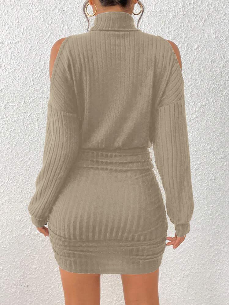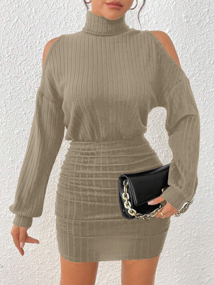 Design: A must-have basic sexy turtleneck mini sweater dress featuring ribbed knit,drop shoulder,lantern long sleeves,cold shoulder,above-knee length, ruched design on both sides, and an elastic band at the waist that accentuates the slimming effect on the lower half. It hugs your body perfectly to show your femininity.