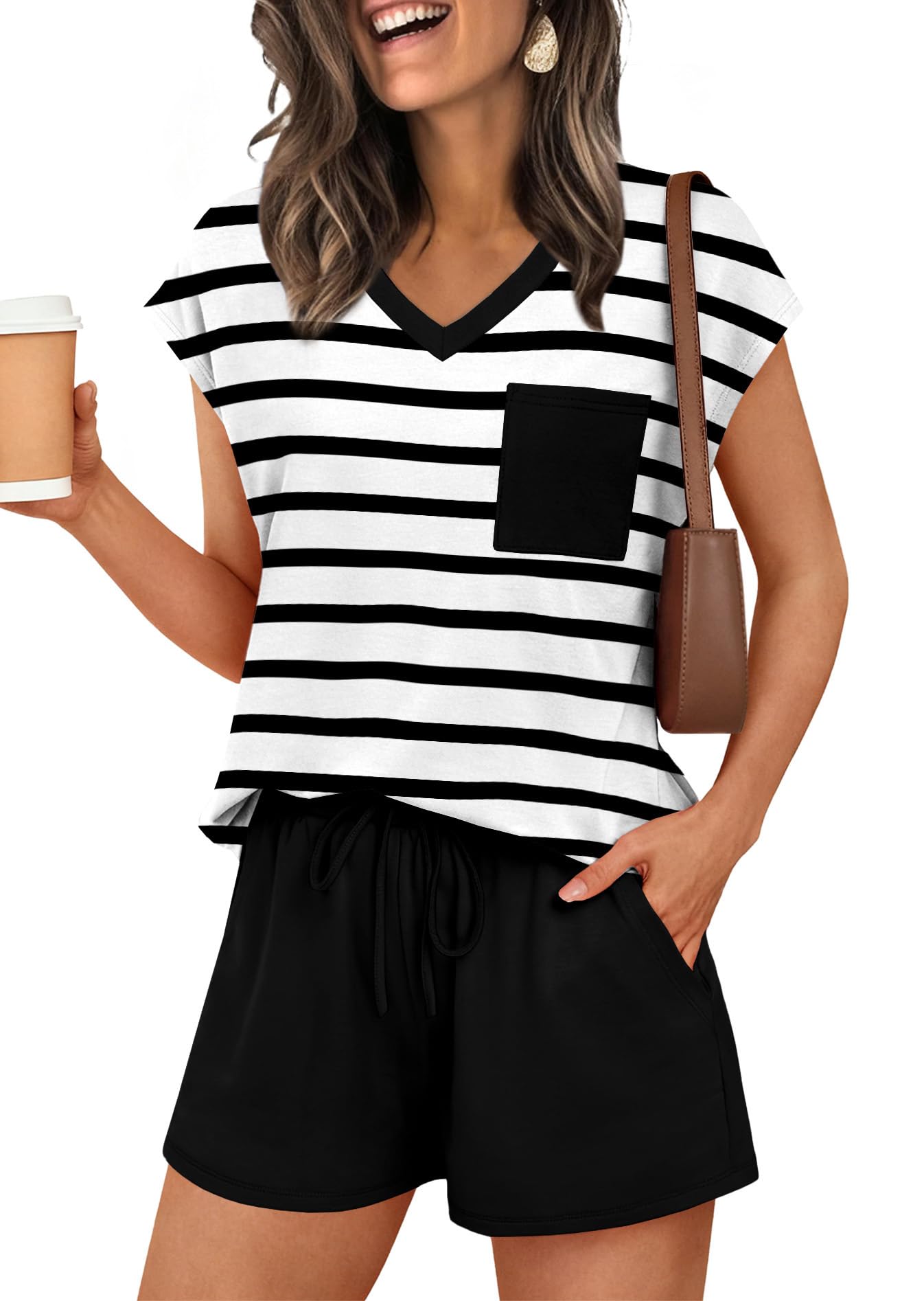 Design: Side-pocket shorts with relaxed fit & adjustable drawstring offer comfort and convenience; the trendy V-neck cap-sleeve top also works as a chic summer piece