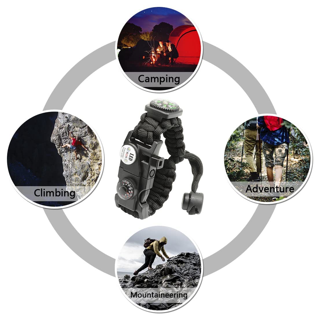 【10ft Paracord Bracelet & Thermometer】:The paracord can withstand weight up to 550lb (249kg); paracord bracelet can be loosen up to 10 feet in any situation when strong rope or cordage is needed. Good to stabilize a tent to build a shelter, create hunter traps, hiking rope and so on. Thermometer is ideal to know local real-time temperature quick(in Celsius)