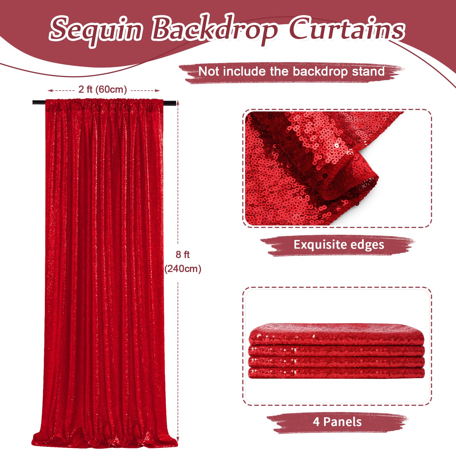 Sequin Backdrop Curtains: Package contains 4Pcs 2ft width by 8ft height backdrop curtains. With a 4-inch rod pocket on the top for easy to be hung on most backdrop stands or curtain rods, and all sides over locked with folded and hemmed edges to ensure the stability during hanging.