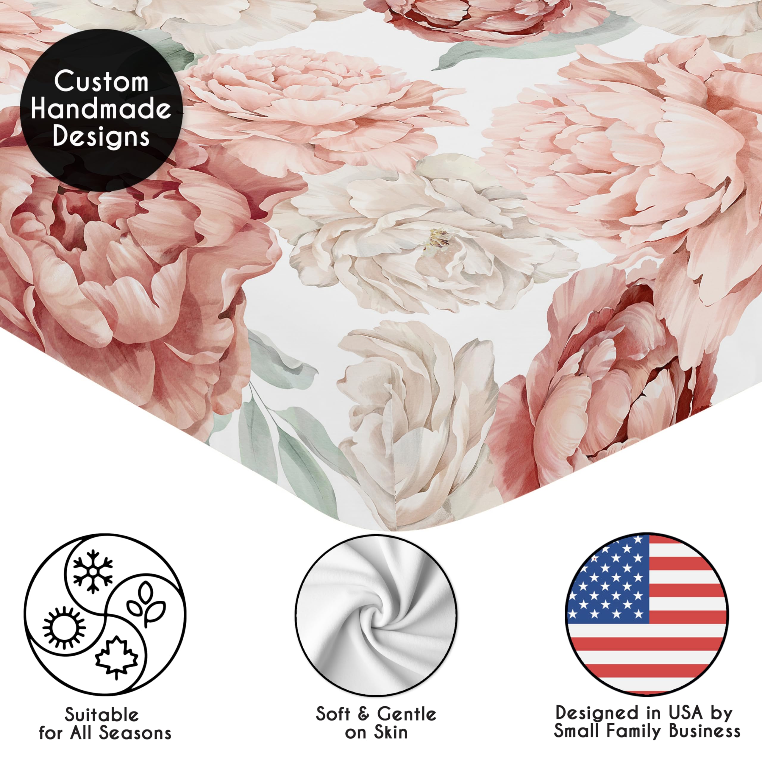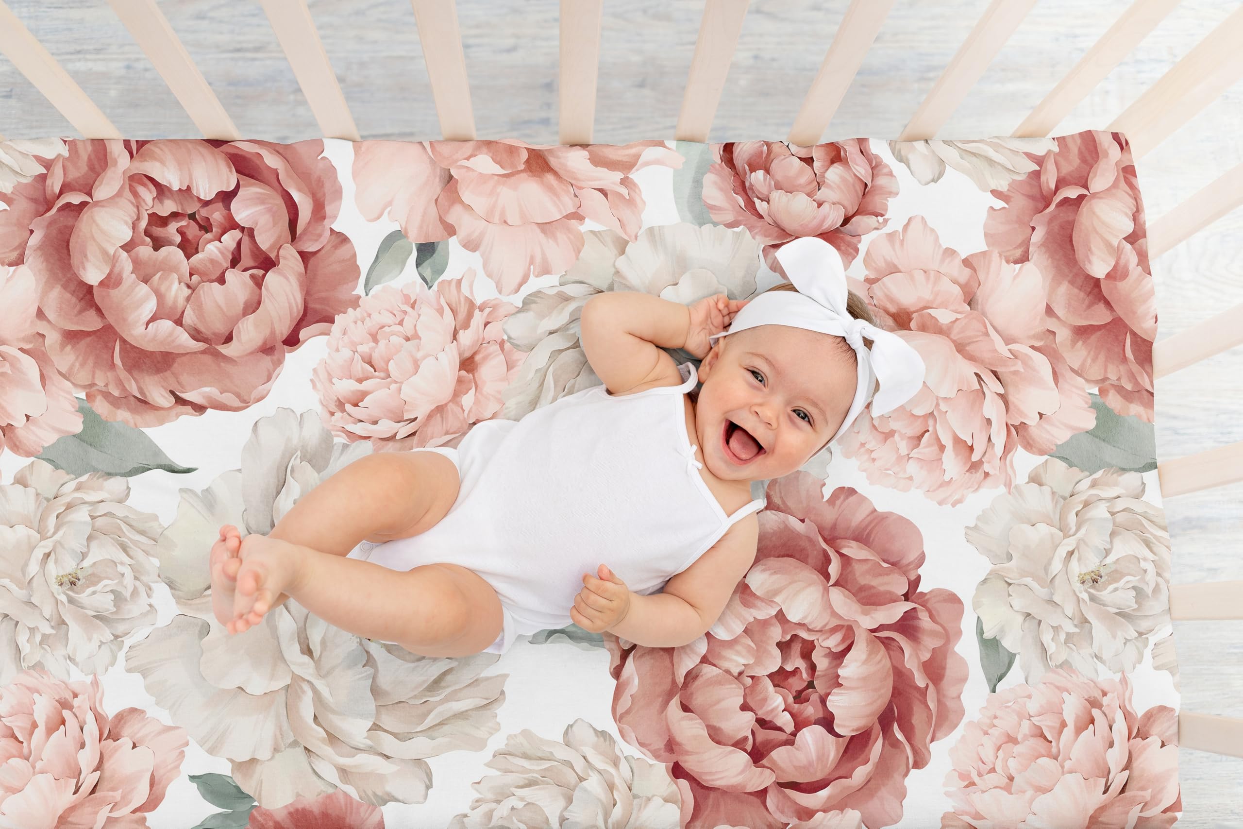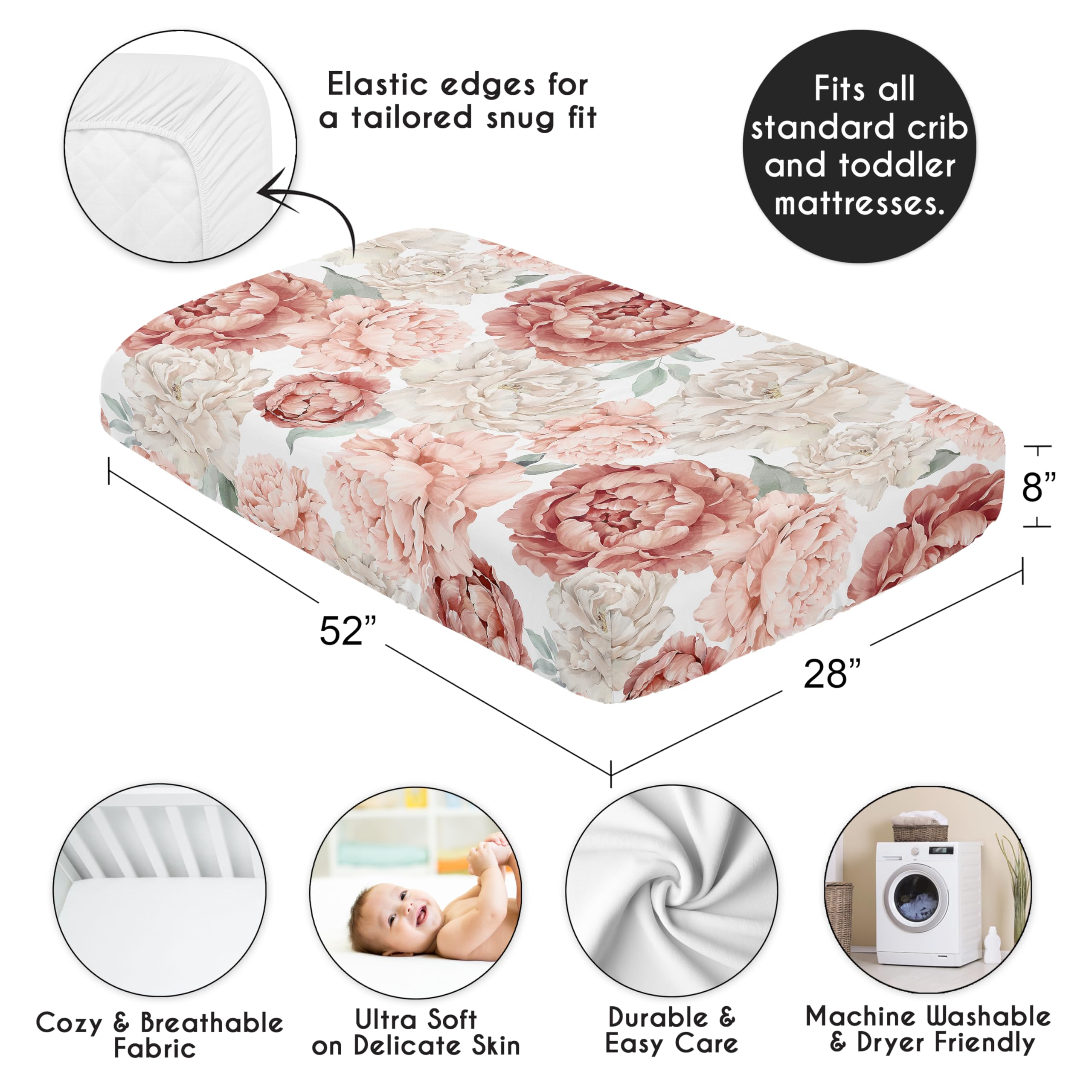 SNUG FIT: Includes (1) Fitted Crib Sheet 52in. x 28in. x 8in. Our newborn standard crib sheets fit snugly, with premium elastic sewn around the entire bottom edge for a secure fit on most standard sized cribs and toddler beds, to reduce shifting and bunching. This brushed microfiber crib sheet features an exclusive design of blush pink, off white, ivory and green boho floral garden, watercolor flower, wildflower peony print and is gentle on delicate skin to foster a soothing sleep environment.
