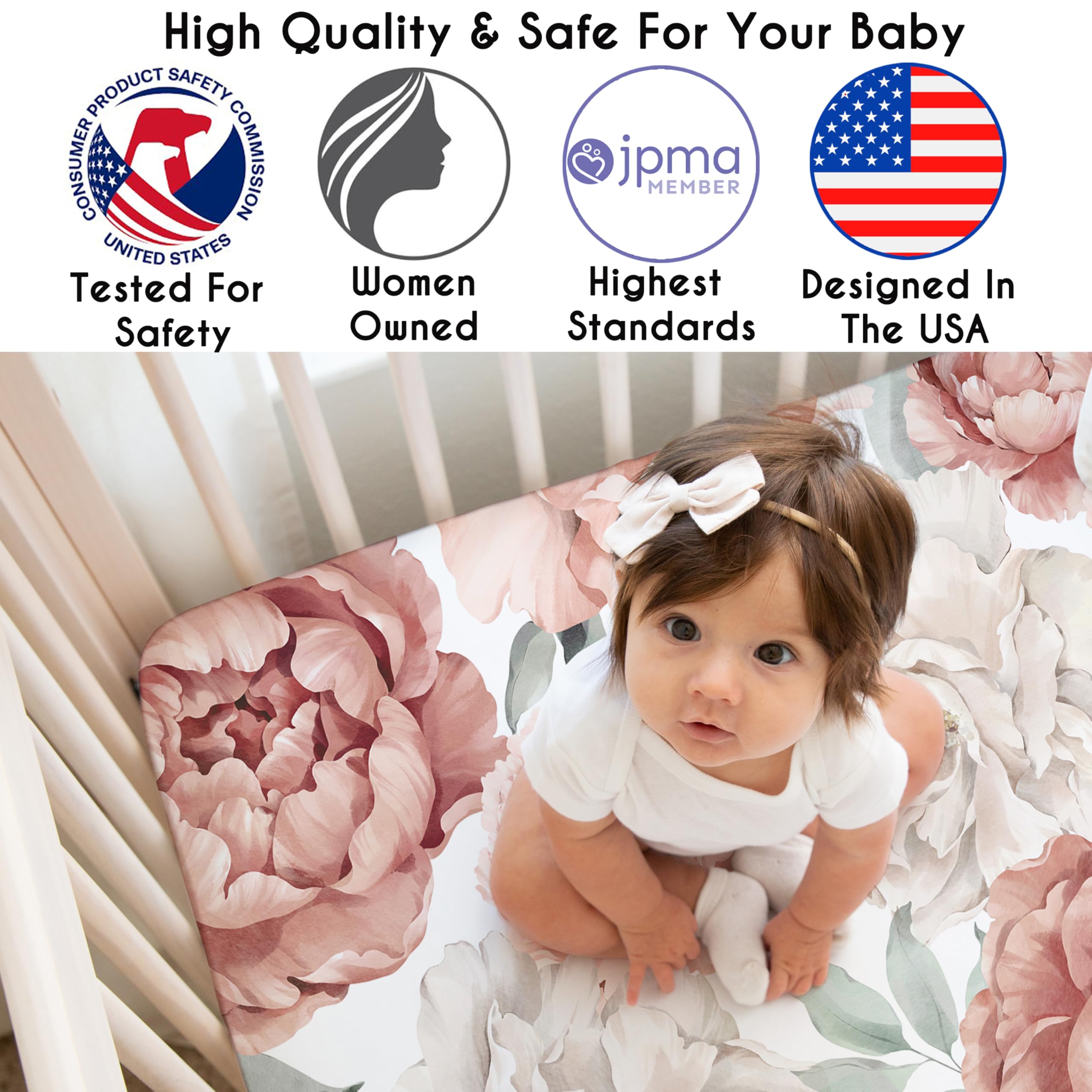 DESIGNED IN THE USA: By real parents who understand the need for comfort, practicality, and style. Sweet Jojo Designs is a small, women owned business. The mom's on our team know a crib mattress sheet is first priority for your baby essentials to ensure a restful night of sleep. We use top fabrics and designs to create soft crib sheets that are stretchy and comfortable for your infant or toddler. We've studied the latest trends in floral crib sheets for baby girl to bring you the finest product.