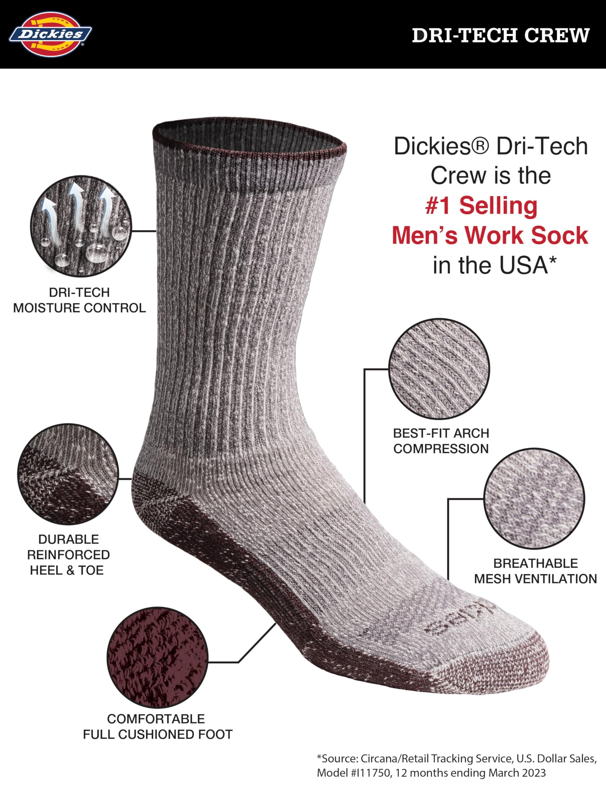 Description Dickies dri-tech comfort 6 Pairs crew with wicking, moisture management fibers keeps feet dry, ventilation channels engineered for air circulation and moisture control, arch compression hugs feet and keeps socks in place, while providing in-step support, Reciprocated heel and toe for superior fit and full cushion comfort