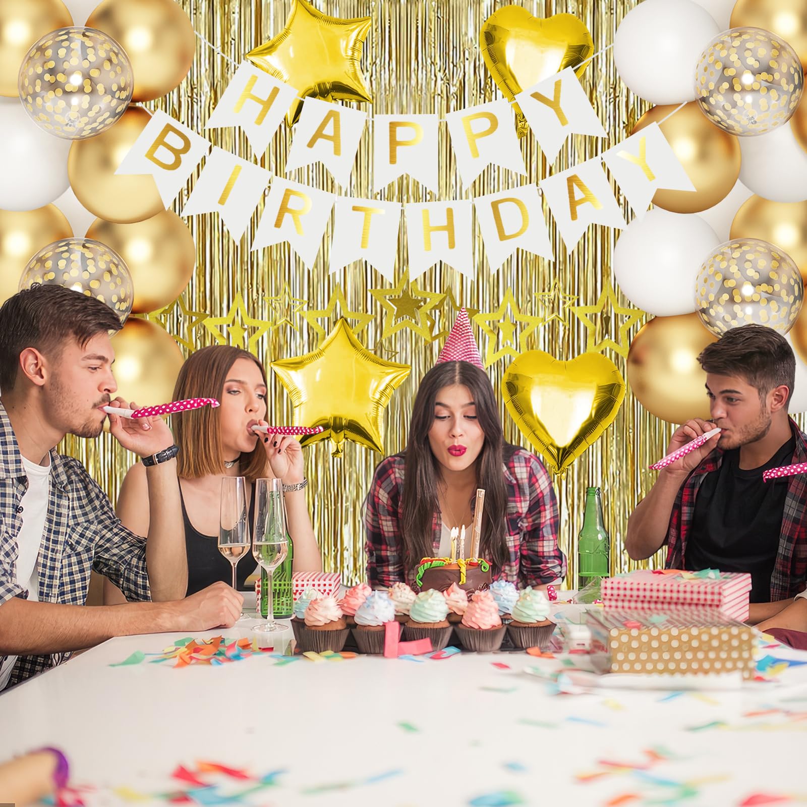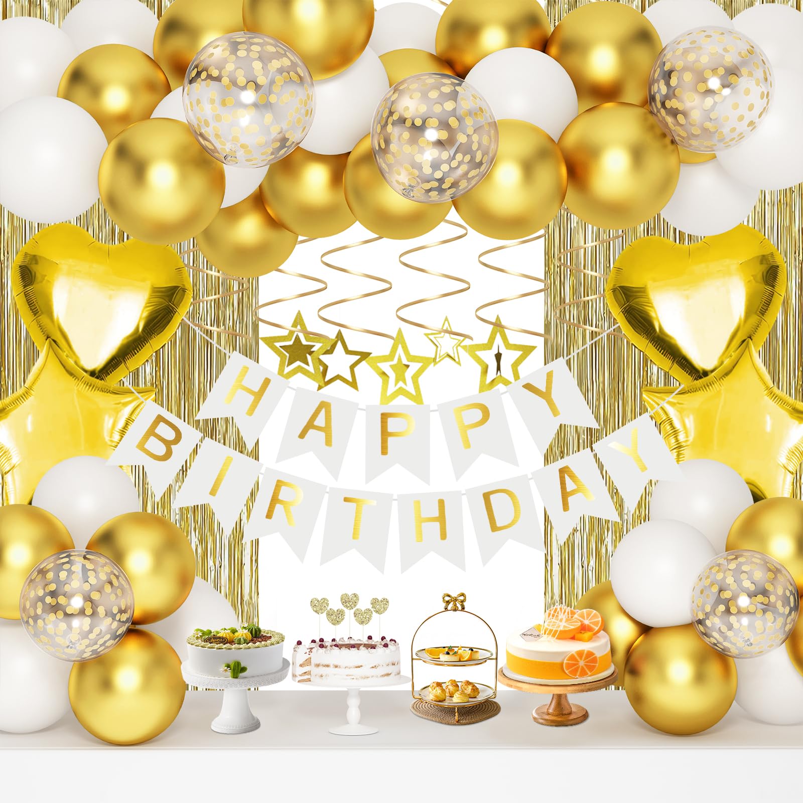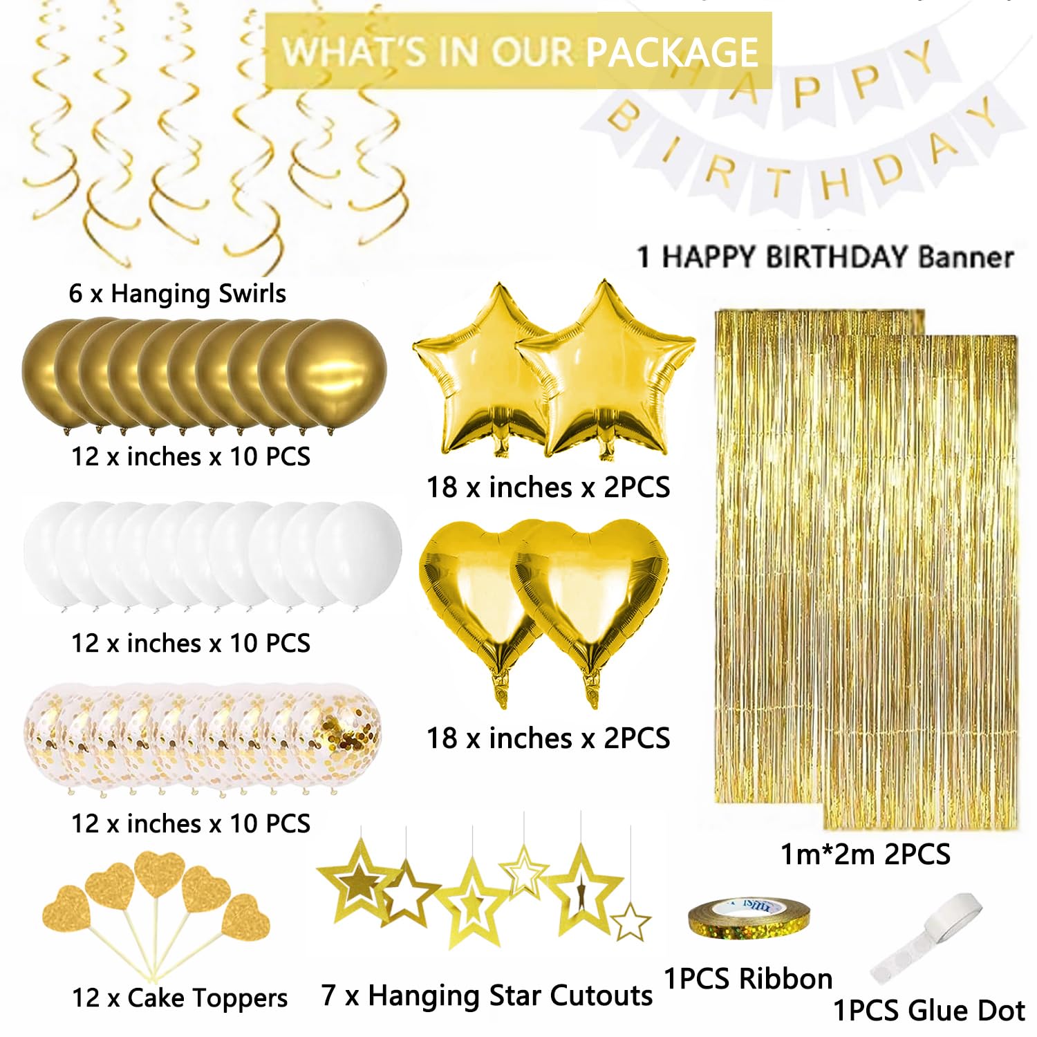 [BIRTHDAY DECORATIONS FOR MEN WOMEN] This quality white gold birthday decorations set which include: Happy Birthday banner, 2pcs gold fringe party curtains, 10pcs confetti balloons, 10pcs gold balloons, 10pcs white balloons, 4pcs gold foil balloons(heart and star),6pcs gold hanging swirls, 7pcs glitter gold star garland, 12pcs cupcake toppers, 1pcs ribbon/ dot glue.