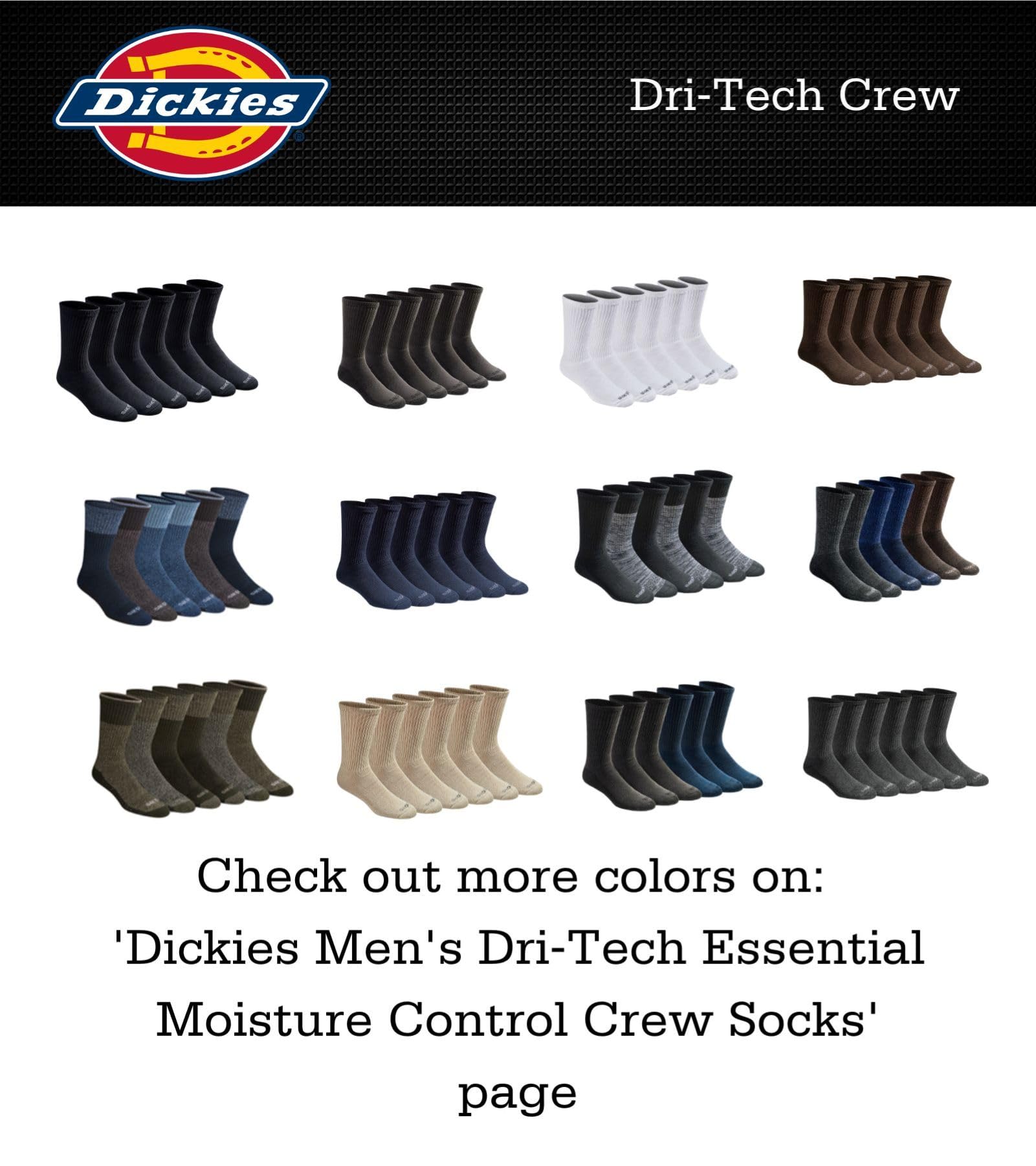 Description Dickies dri-tech comfort 6 Pairs crew with wicking, moisture management fibers keeps feet dry, ventilation channels engineered for air circulation and moisture control, arch compression hugs feet and keeps socks in place, while providing in-step support, Reciprocated heel and toe for superior fit and full cushion comfort