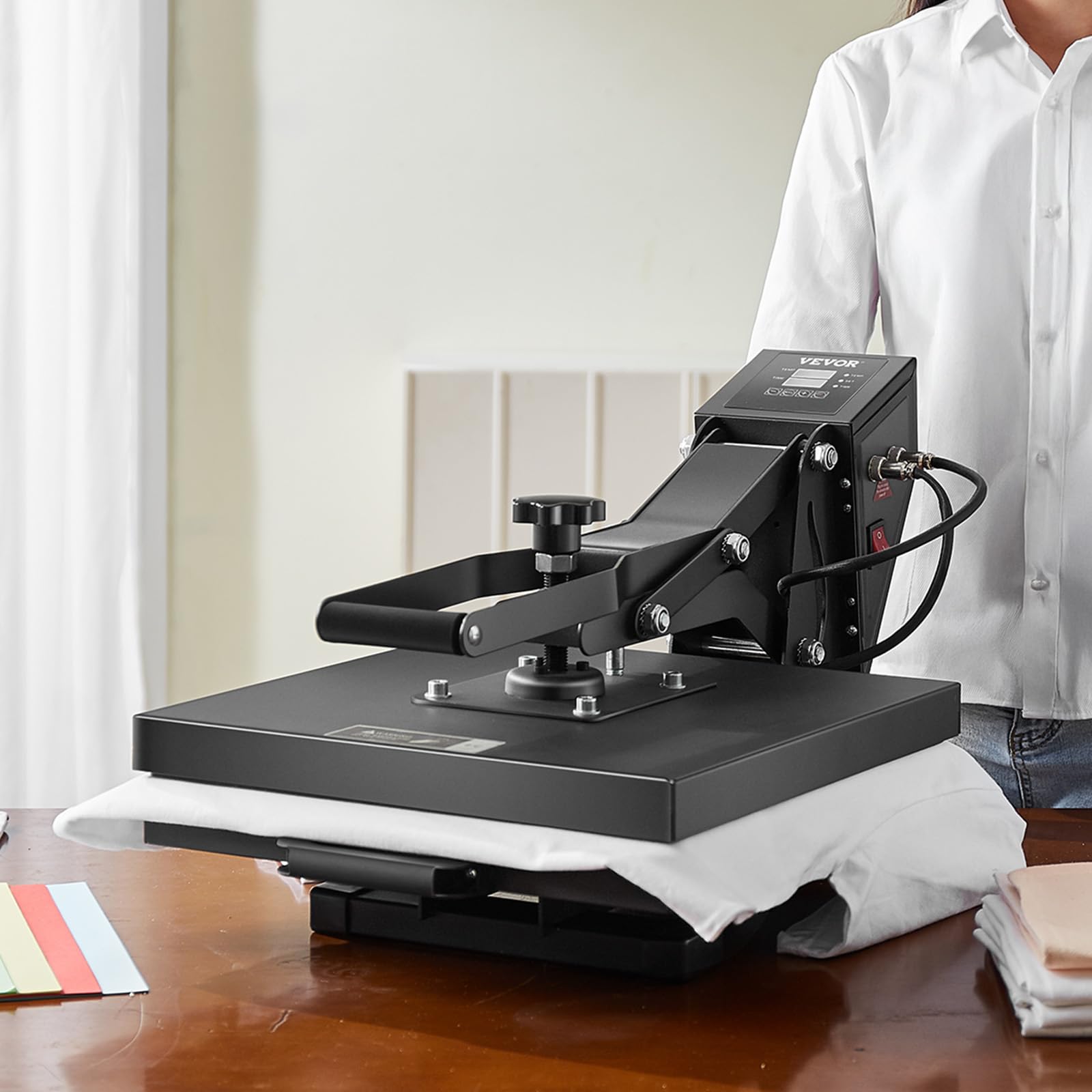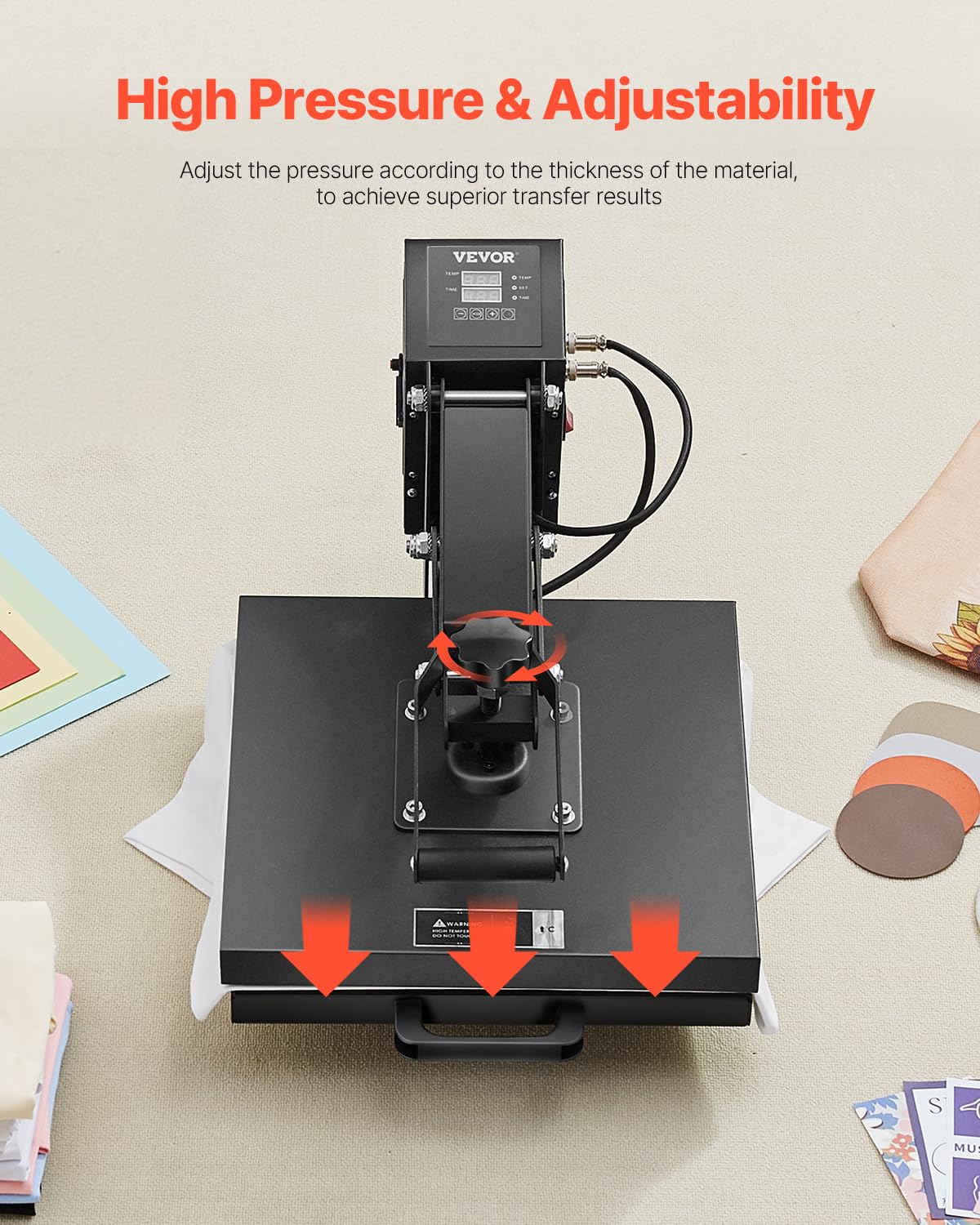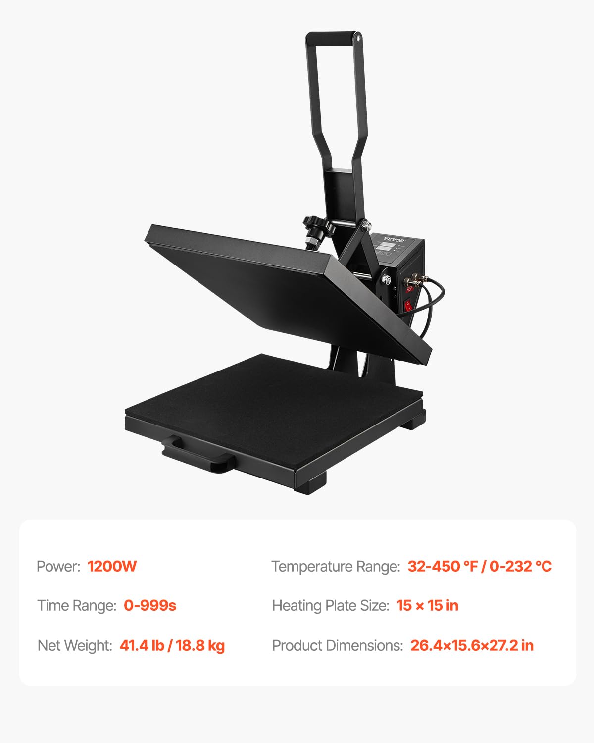 15 x 15 INDUSTRIAL HEAT PRESS: The VEVOR heat press has a larger heating pad measuring 15 "x15" to transfer colorful images and text onto flat items of all sizes. Featuring a sponge pad and Teflon coating, it heats up faster and transfers better. It also reduces odors during operation and lasts up to 20,000 hours.