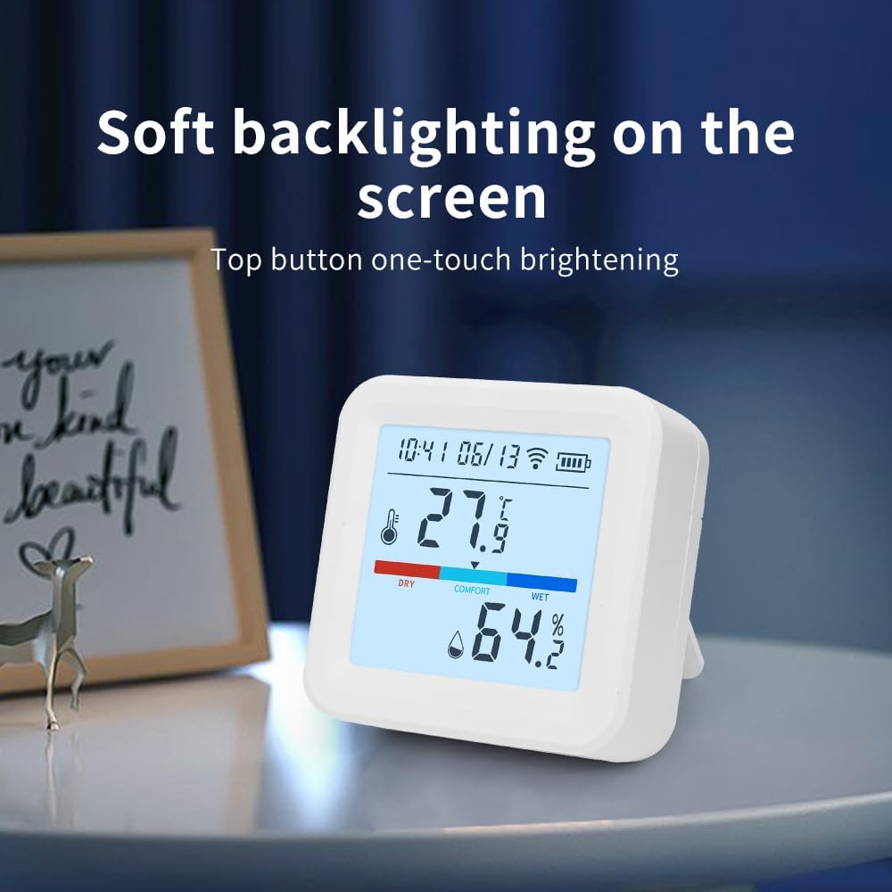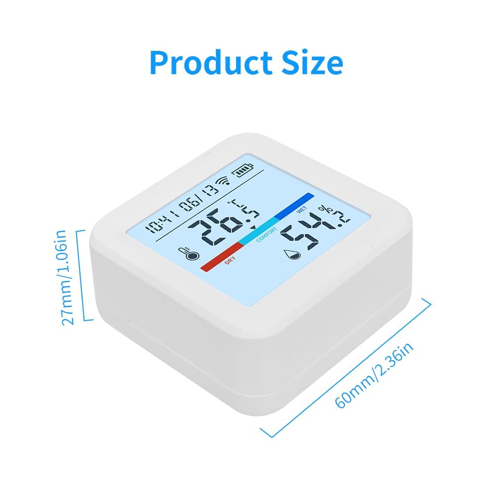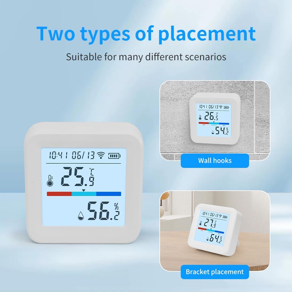 Stay connected to your environment with this Smart WiFi Thermometer and Hygrometer, the perfect solution for accurate indoor temperature and humidity monitoring in modern smart homes. Whether you're monitoring a greenhouse, wine cellar, baby nursery, garage, reptile terrarium, or cigar humidor, this wireless sensor ensures optimal climate control anywhere. With support for the Tuya Smart and Smart Life apps, this device functions as a WiFi temperature sensor and humidity meter. You can check live readings remotely, get real-time app alerts, and set custom high/low thresholds — ideal for homeowners, renters, pet owners, and plant enthusiasts. It’s also a great tool for RV temperature monitoring, sauna rooms, and indoor air quality control. The large, backlit LCD display is easy to read, even in dark rooms. Pair it with Alexa or Google Assistant to receive hands-free updates like “What’s the temperature in the nursery?” — perfect for parents or tech-savvy users building a smart home ecosystem. This compact indoor thermometer (2.36 x 1.06 inches) mounts easily to any wall, shelf, or table with the included bracket. Its digital display, ±0.5°C temperature accuracy, and ±3% humidity deviation make it a reliable choice for any indoor/outdoor thermometer need. It runs on 3 included AA batteries — no hub or wiring required. Use it as a digital room thermometer, humidity sensor for plants, refrigerator thermometer, or smart RV temperature alarm. Perfect for use in bedrooms, basements, freezers, grow tents, wine storage, or greenhouse setups. This remote thermometer doubles as a wifi thermometer for home, reptile enclosure monitor, or smart hygrometer for cigar storage.