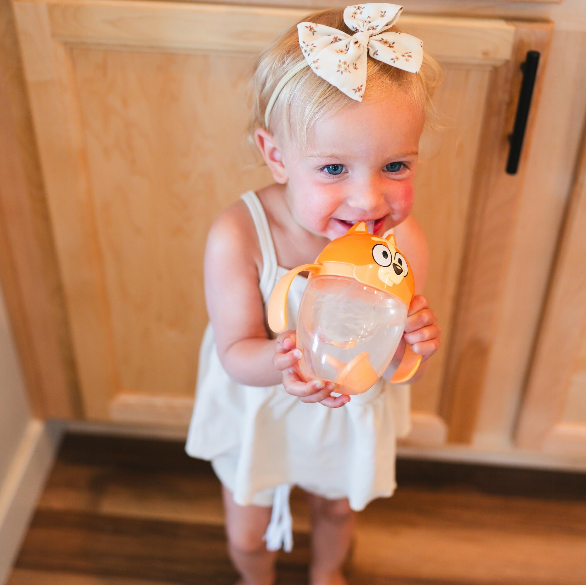 Bluey's sister Bingo is helping babies learn to sip from a straw with The First Years Weighted Straw Sippy Cup! This Bingo baby cup makes sure no drop is left behind thanks to the weighted straw that stays in the liquid for easy sipping as your baby learns to drink. Even as your little one tips the baby cup from side to side, the weight stays in the right place. This baby sippy cup's training handles make it easy for little hands to hold on to and the flip top on the sippy cup straw does double duty by keeping the straw clean and keeping the drink inside the kids' cups when it’s closed. Your little one will love sipping with their friend Bingo from Bluey in this colorful and fun kid's cup. And after your baby's done with a busy day of sipping, you'll appreciate the Bluey cup's dishwasher-safe design that makes these toddler drinking cups easy to keep clean. This cute baby straw cup is the perfect solution for babies transitioning from a bottle or toddlers learning to drink from a straw while transitioning from standard baby sippy cups. It makes a great gift for Bluey fans ages 6 months and up.