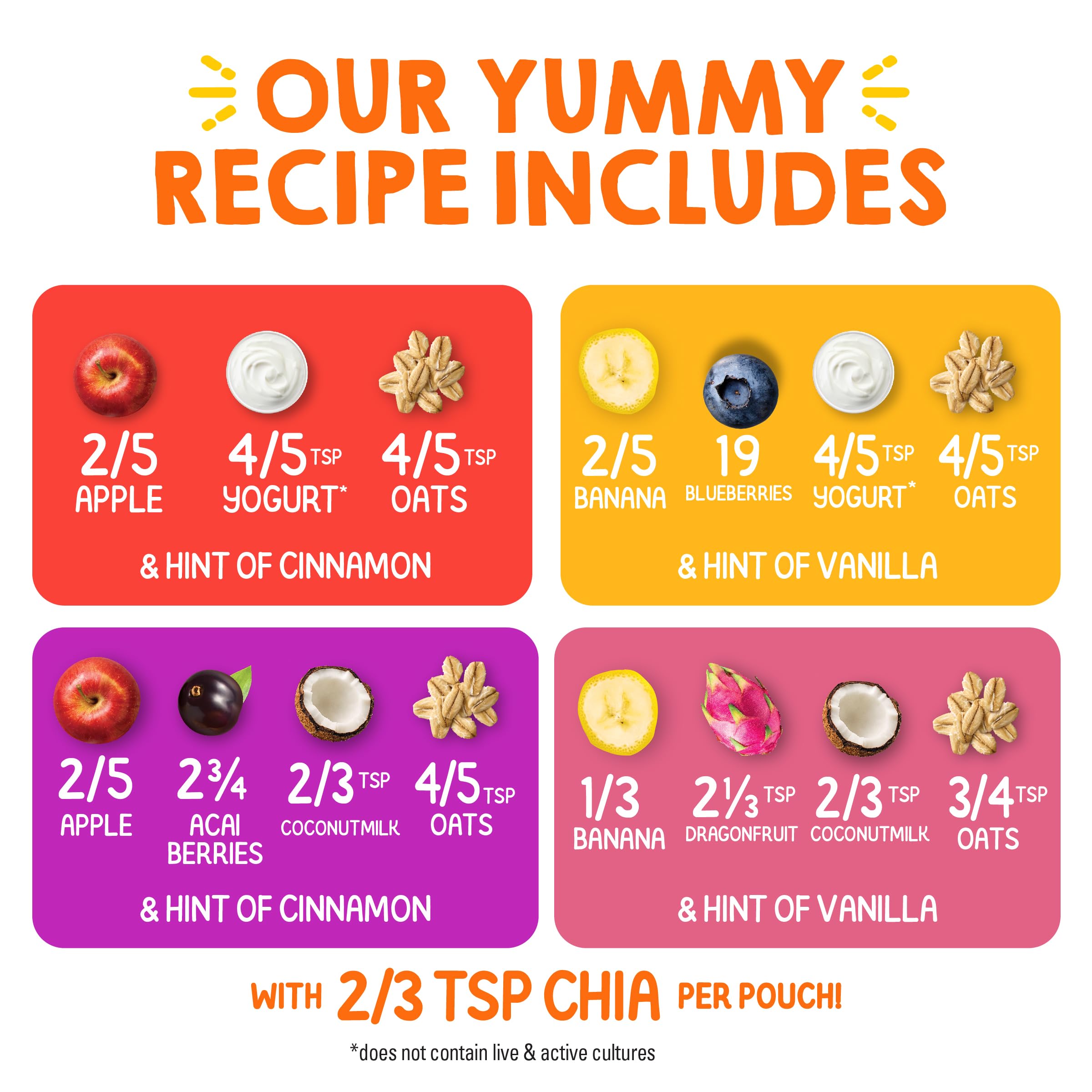 SUPER MORNING: Great for any toddler who is on the move, Super Morning Pouches help turn a good morning into a super morning. Each pouch offers 3g of fiber, omega-3s, organic fruits, whole milk yogurt* or coconut milk & whole grain oatsβ for a yummy start to their day! *Does not contain live & active cultures