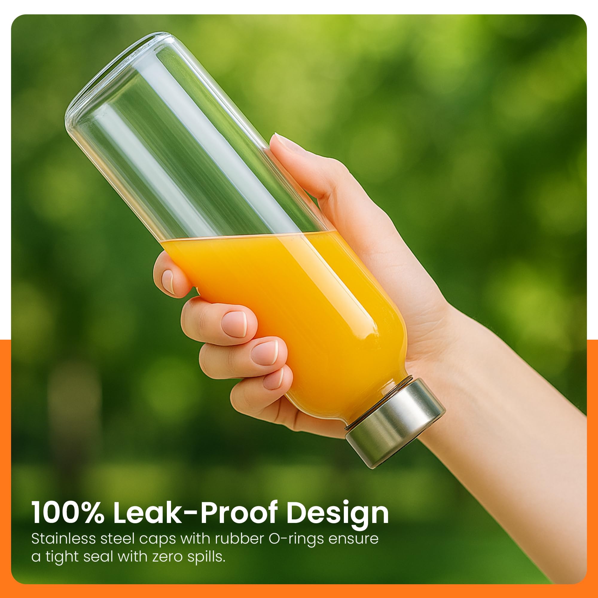 AIR AND WATER-TIGHT STAINLESS STEEL CAP WON’T LEAK: Each cap is lined with a rubber O-ring so it will never leave a leaky mess in your car or bag. Oxygen can’t get in to break down the enzymes and ruin your juices.