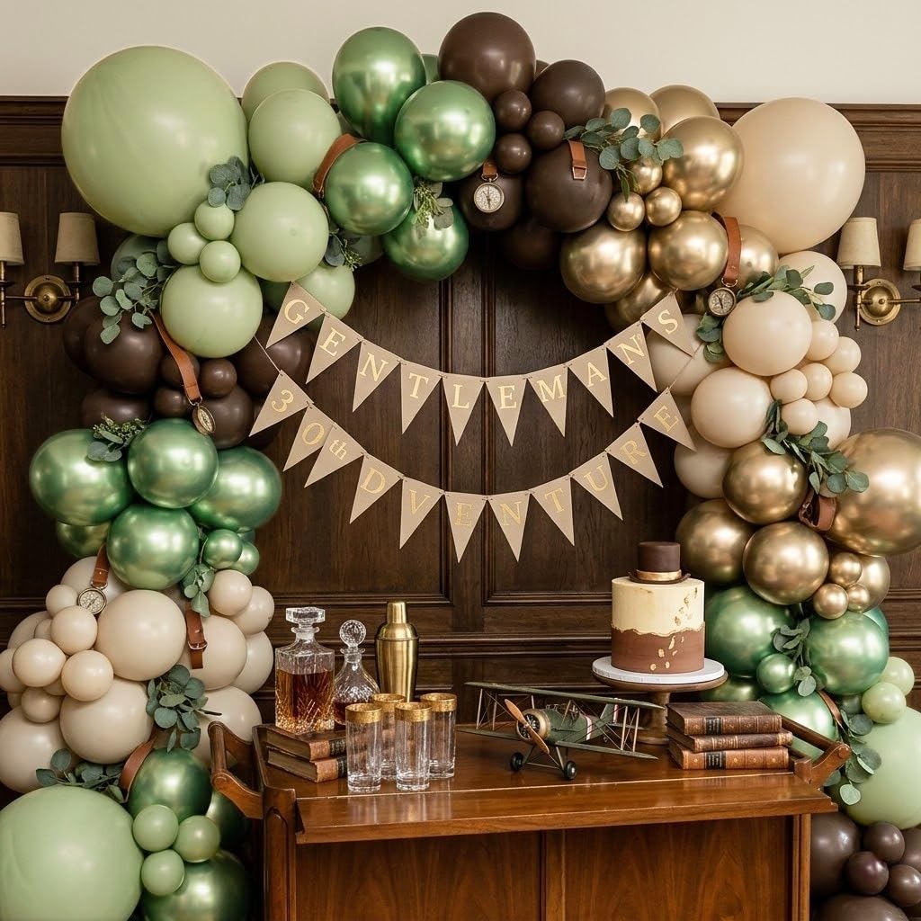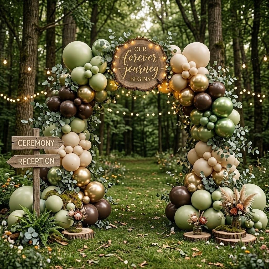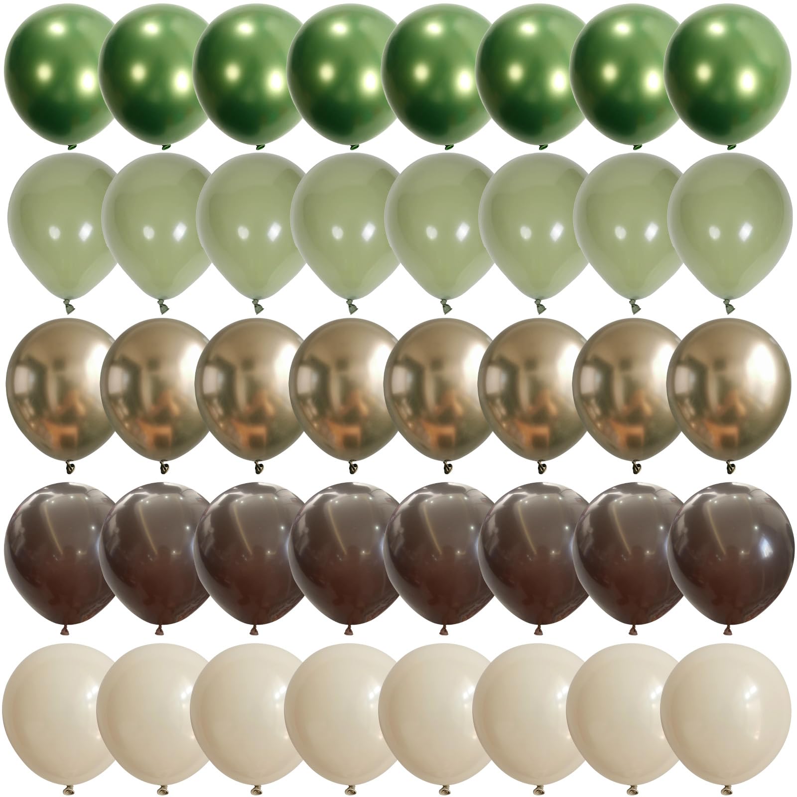 Party Balloons Set: The camping balloons set have 60pcs 12inch helium balloons, include 20pcs sage green balloons, 13pcs cocoa dark brown balloons, 12pcs beige cream balloons, 7pcs chrome gold balloons, 8pcs chrome sage green balloons, 2pcs balloon ribbon (white, bright green).
