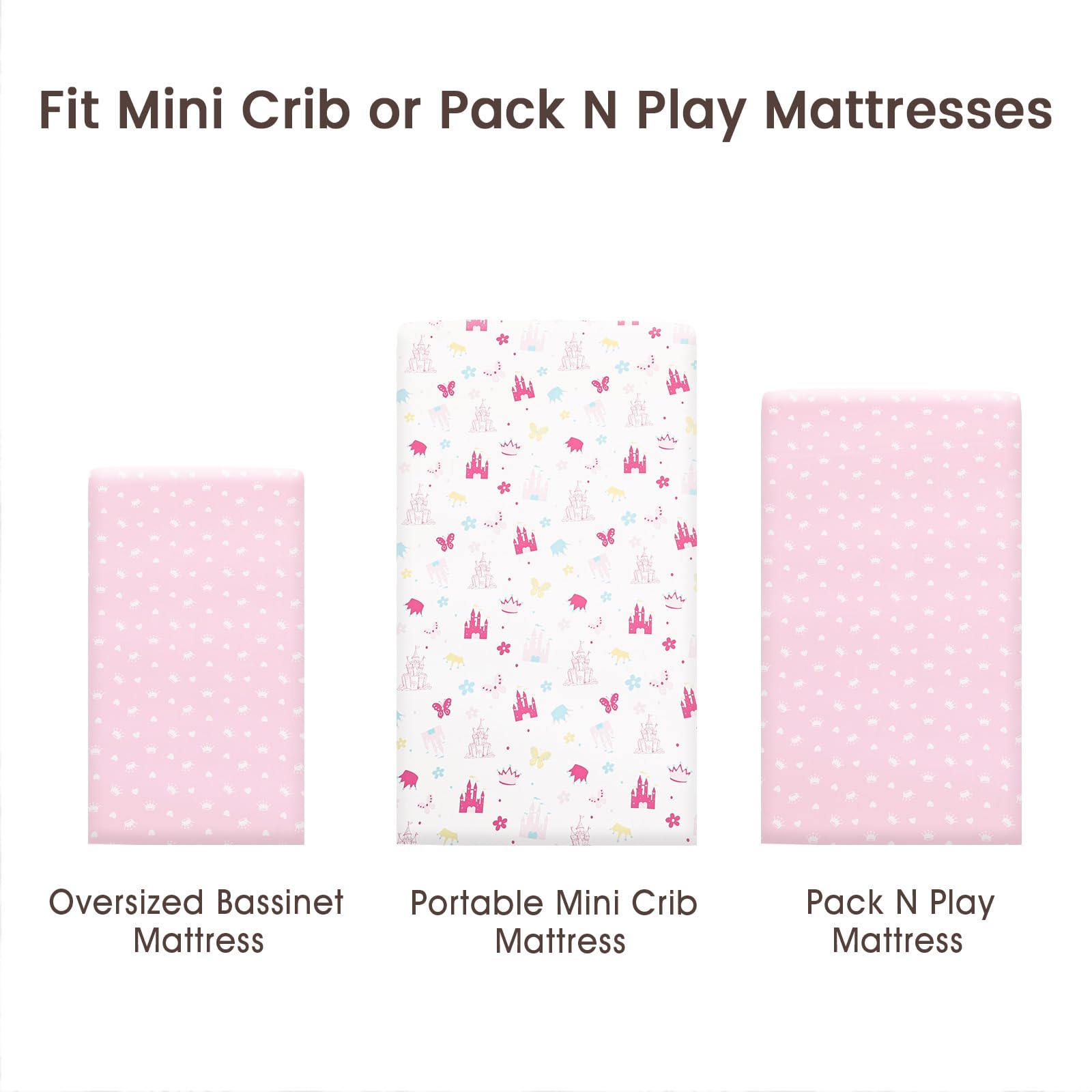 Perfectly Fit: Stop worrying whether these sheets can fit your mini mattress or playard mattress - thanks to its thoughtful construction, Our mini crib sheets are specifically designed for most 1" - 5" mattresses for pack and play, play yard, playpen, mini portable crib. 5" deep pocket and whole strong elastic band help the sheet stay flat right in place securely and snugly. No worry about ill-fitting.