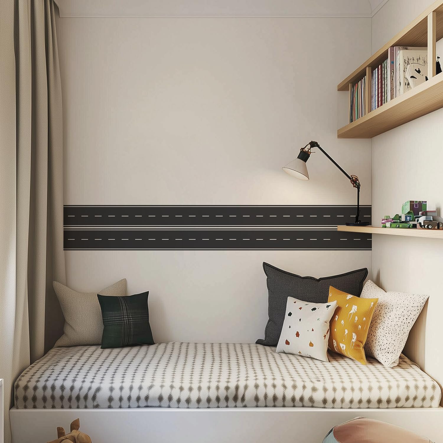 Diverse Styles: bright color matching, with road in a variety of shapes and colors, very suitable for a little boy’s bedroom or nursery, but also can be used to dress up home wall border.