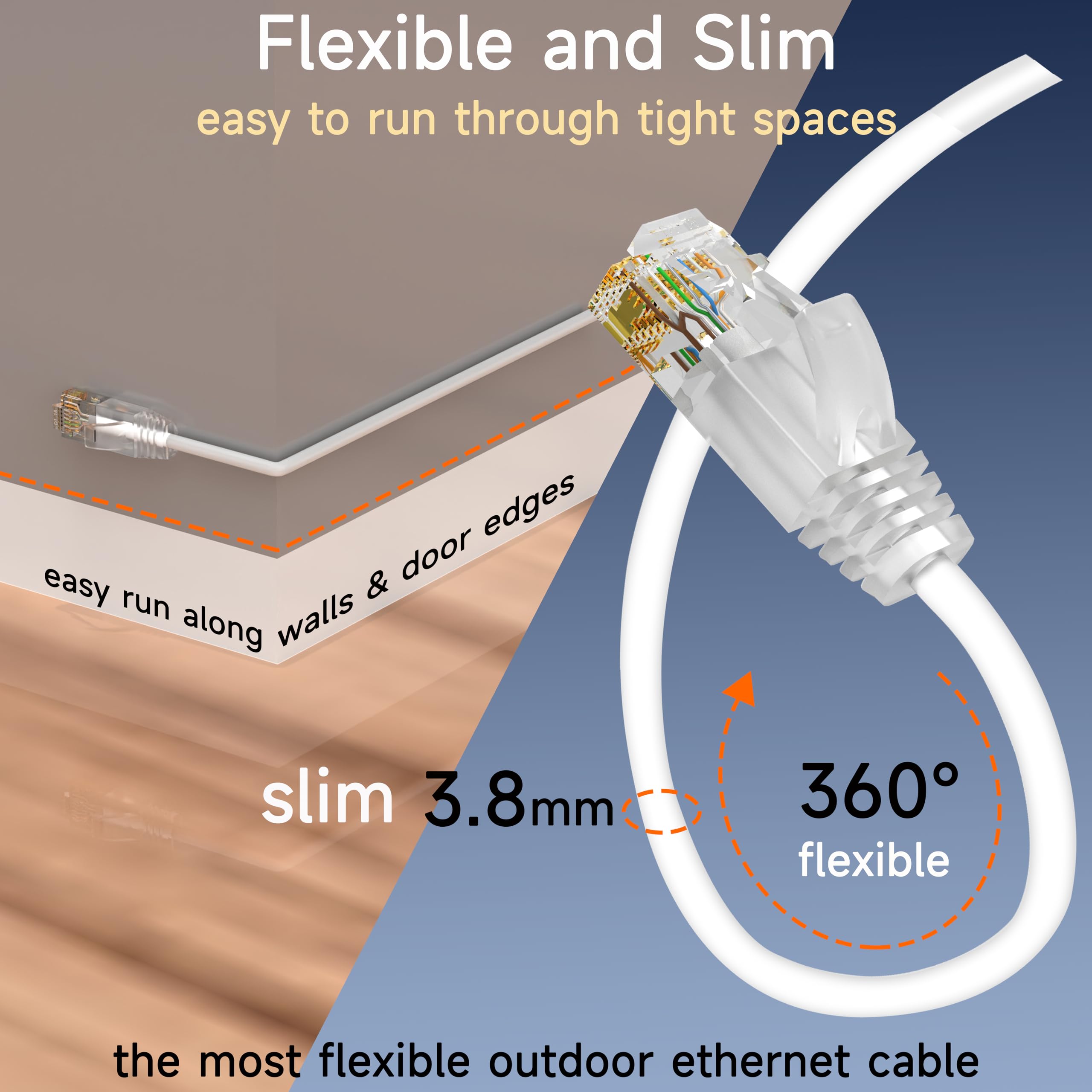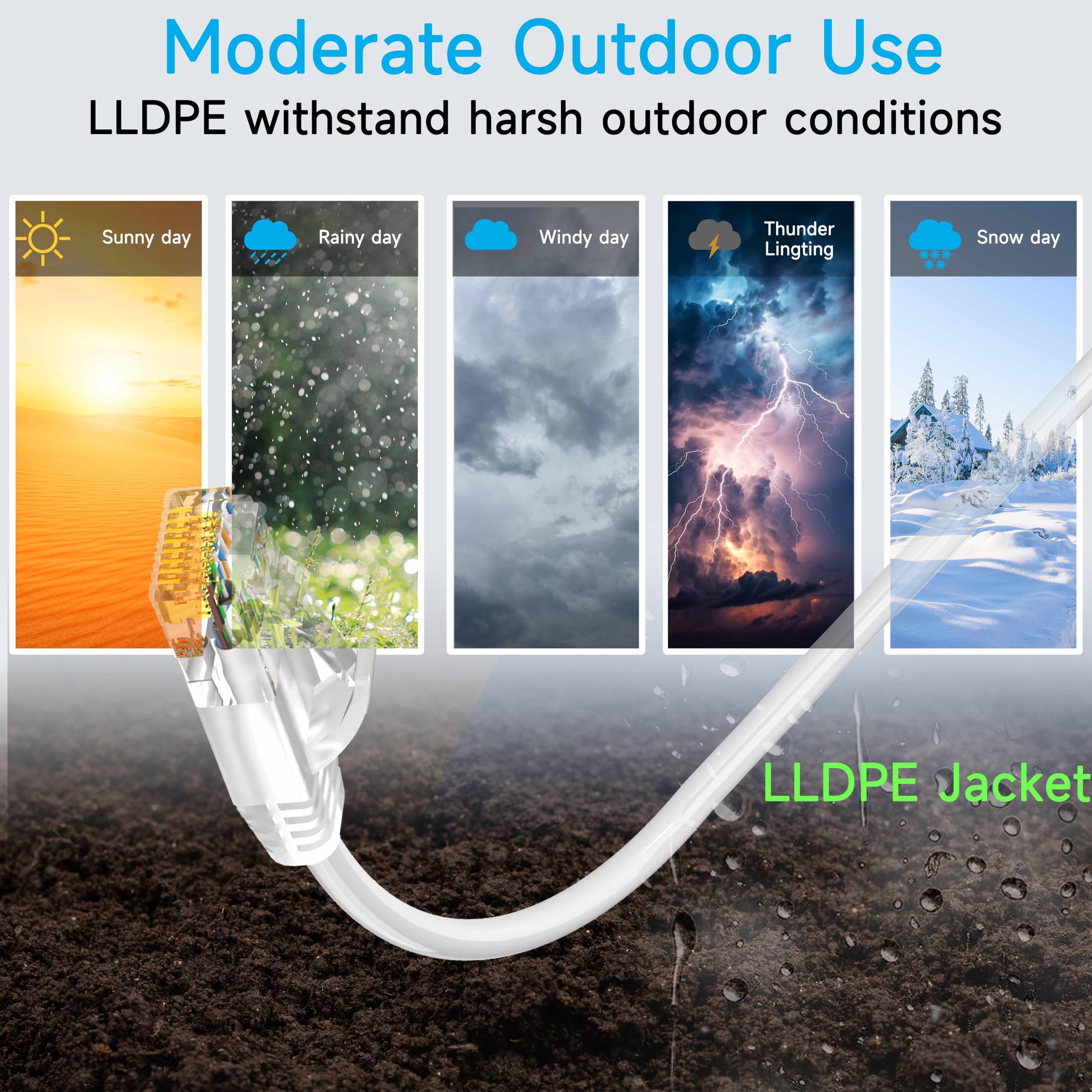Moderate Outdoor Use : The waterproof cables enable cat6 ethernet cable to withstand harsh outdoor conditions. The sturdy LLDPE outer sheath of cat 6 outdoor ethernet cable is weather resistant, highly resistant to rain, snow, and harsh sunlight, ensuring stable connection under all conditions.