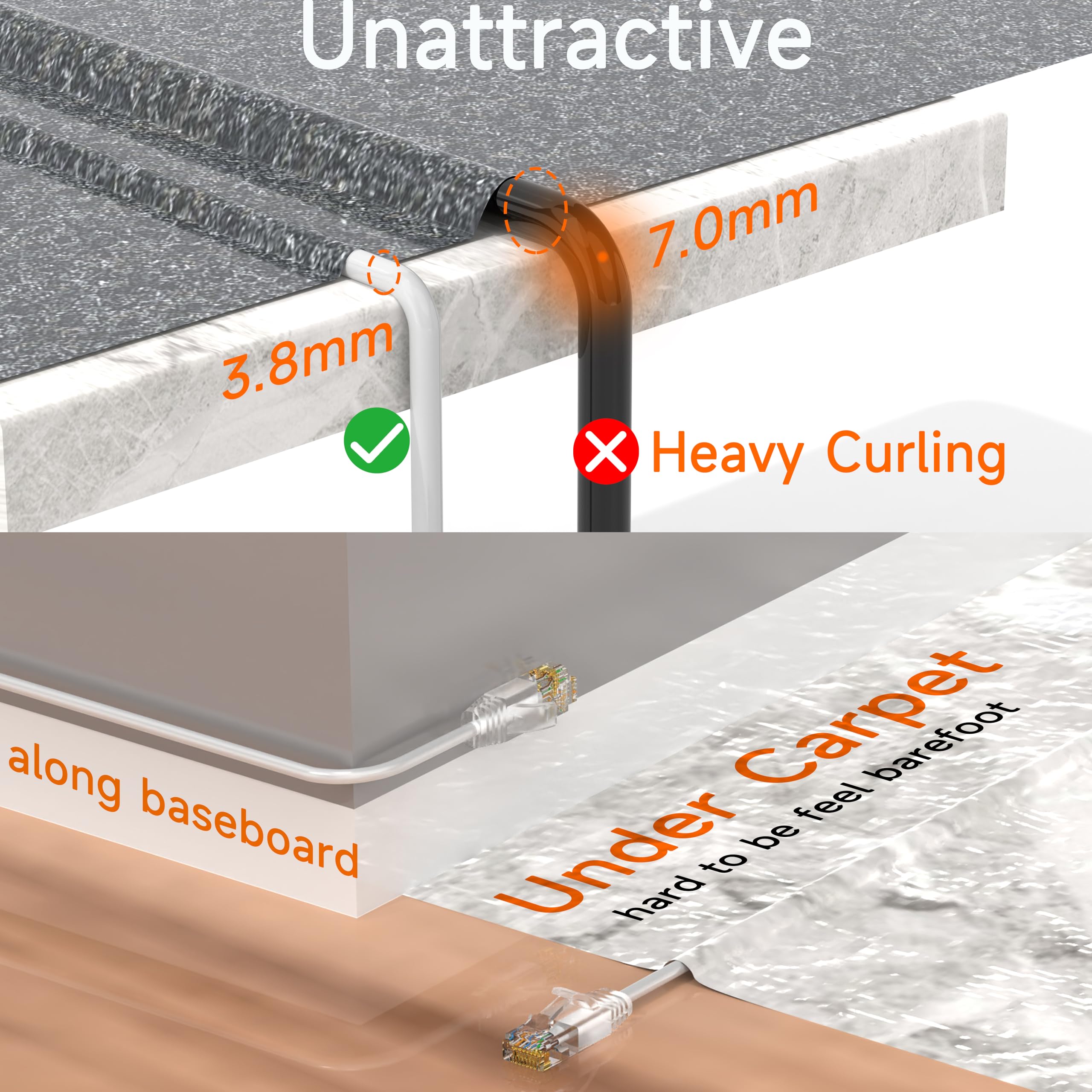 Unattractive: The thin design makes cat 6 ethernet cable 100 ft very easy to run along walls and carpets, and then up walls along door frames. It's so thin, almost gone, unless you really want to find cat 6a ethernet cable 100 ft, you can't even feel it barefoot.