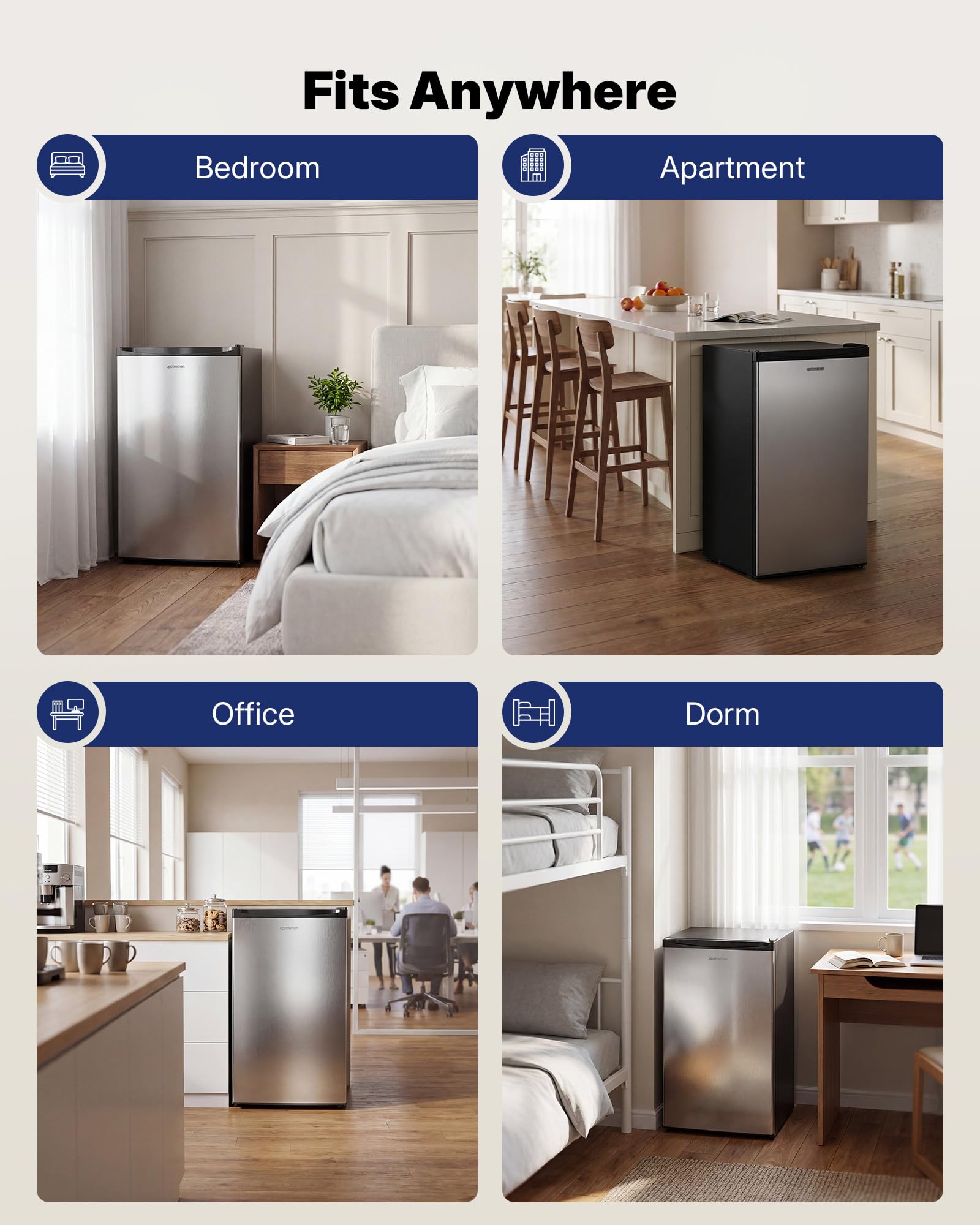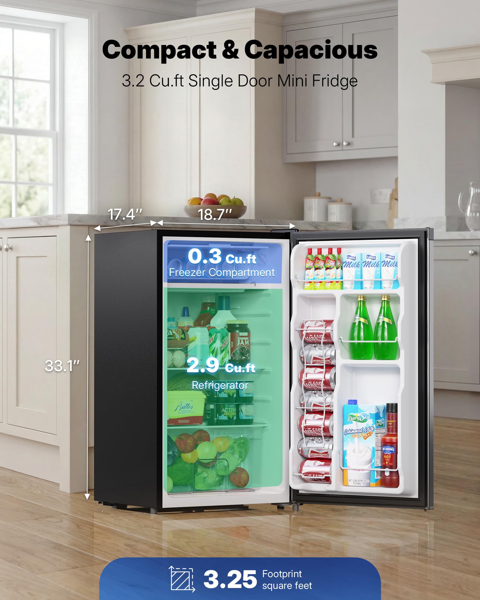 Single-Door: This mini fridge measures 18.7’’*17.4’’*33.1’’(W*D*H) and has 3.2 Cu.ft(90.6 L) capacity including freezer. The single door refrigerator design is convenient and space efficient. While being able to grab ice cubes and drinks at one step, this single-door fridge has more capacity compares to those double-door fridges with the same size. The mini fridge storage is greatly utilized, occupies a little space, making it perfect for dorms, offices, bedrooms, RV cars and garages