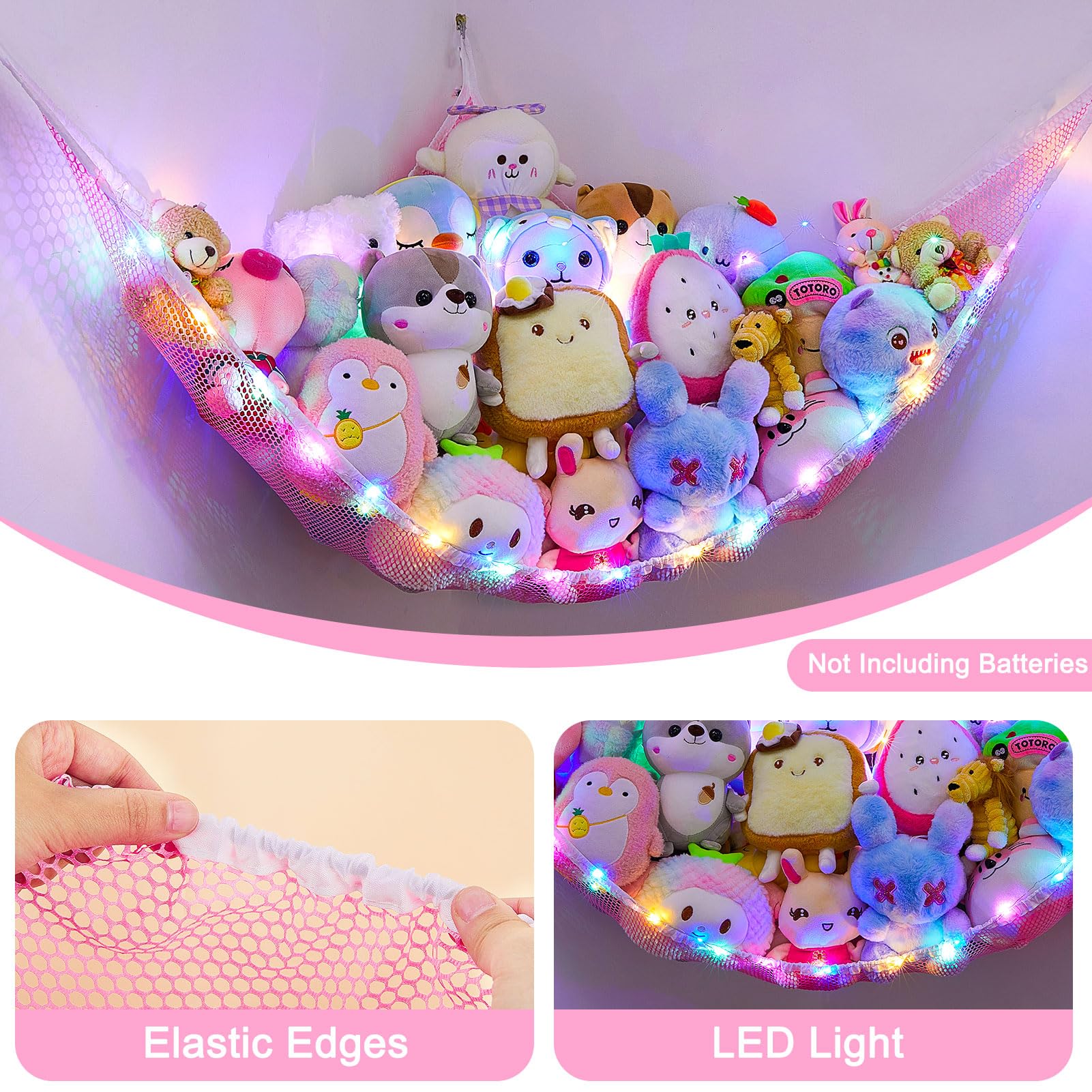 Toy Hammock: Our stuffed animals net or hammock can be a decoration for your kidsroom; Come with LED light, can add a cozy and fun atmosphere