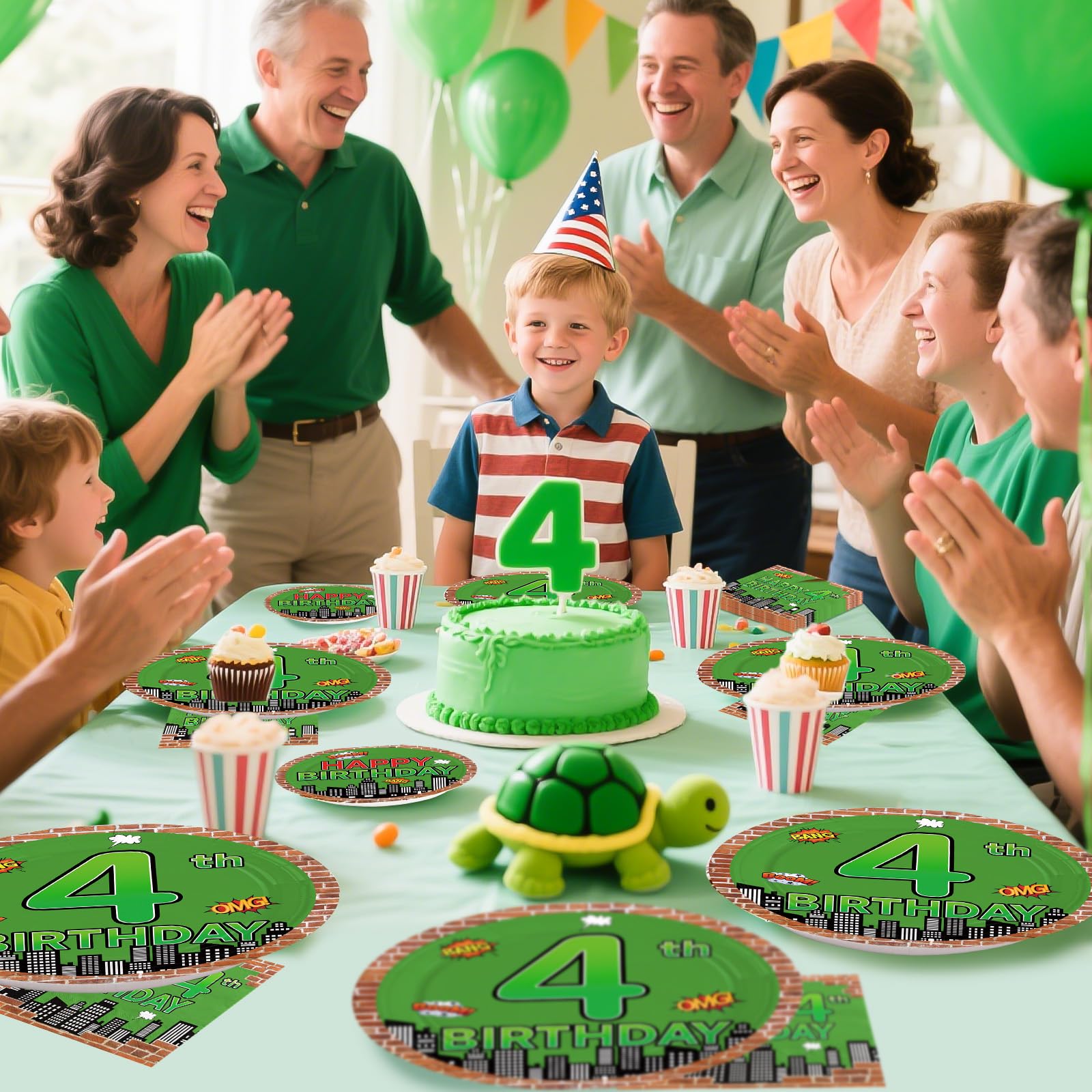 Grencian 96Pcs Turtle 4th Birthday Decorations 4th Birthday Plates for Boys Comic Hero Plates and Napkins Green Comics Tortoise Party Supplies for Kids 4 Years Old Cartoon Turtle Theme Party Serves 24