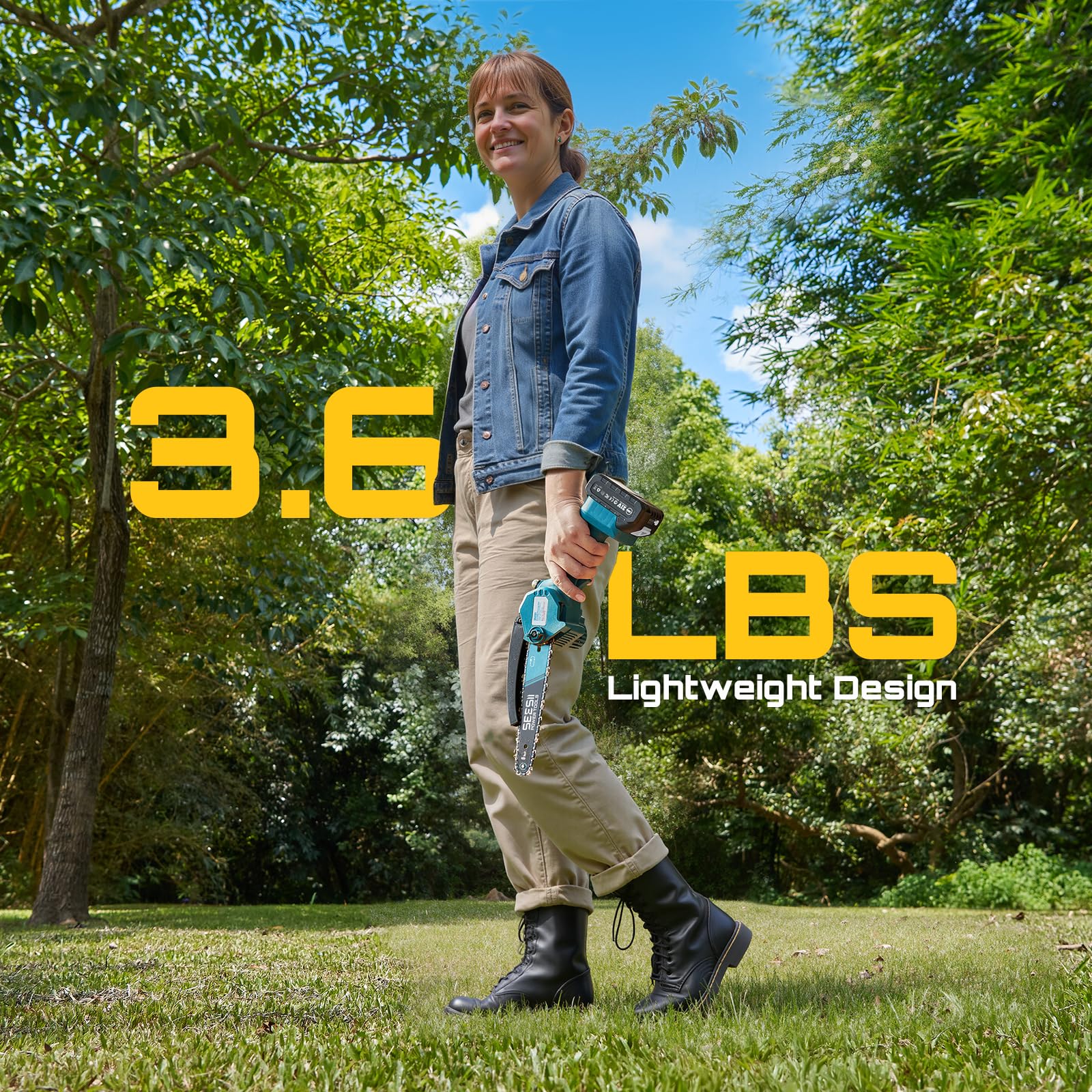 Enhanced Safety Features: Your safety is our priority. This mini chainsaw includes a dual safety lock system, requiring simultaneous activation of the safety lock and trigger to start. The integrated splash guard also protects against wood chips, ensuring a safer and cleaner cutting experience
