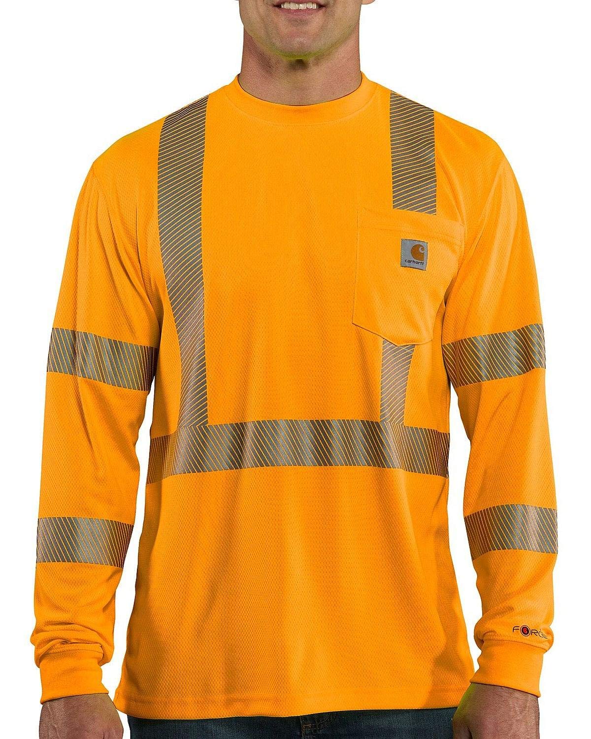 Description Rugged gear that's earned its stripes, the Carhartt Force High-Visibility Long-Sleeve Class 3 T-Shirt is constructed of 4.25-ounce bird's-eye knit, 100% polyester Force fabric. This hard-working, sweat-wicking and stain-fighting fabric stares down heat and grime; sweat's about to lose its wet. The t-shirt's also built with 3M Scotch lite Reflective Material-5510 Segmented Home Wash Trim, which is segmented for superior breathability and durability plus an enhanced range of motion. In addition, it maintains its performance through 75 home launderings. There's also a rib-knit crewneck collar and cuffs plus a handy left-chest for tools, pens, glasses and more. The tag less neck label eliminates chafing and side-seamed construction minimizes twisting. 4.25-ounce, 100% polyester bird's-eye knit Force fabric wicks away sweat and releases stains ANSI Class 3, Level 3 compliant 3M Scotch lite Reflective Material-5510 Segmented Home Wash Trim Relaxed fit Meets ANSI/ISEA 107-2010