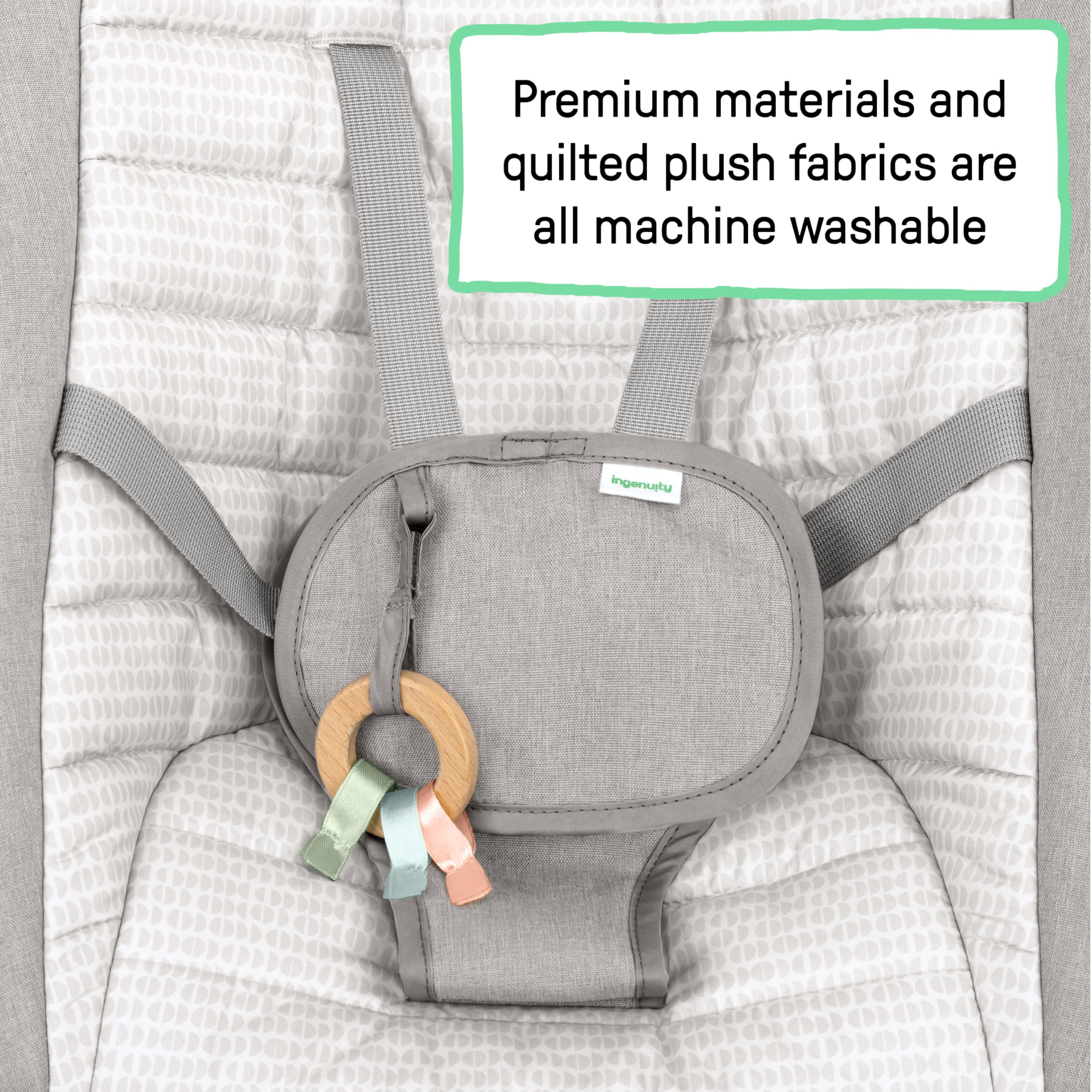 From bottles to belly-rubs to blankies, we've all had days where nothing seems to keep baby calm. Those are the moments that inspired us to create the Keep InMotion Automatic Rocking Seat, with plenty of options to soothe, calm, and entertain baby. This rocker features 2 speeds, so as baby explores each rhythm you can select the one that suits them best. With the switch of a button on the included remote control, you can give baby a seat that mimics your own gentle rocking motion, with 2 recline options for another level of comfort. Plus, the remote clips onto the attached loops to ensure it stays within parent's reach. In addition to rocking, this chair offers soothing vibrations and calming music with volume control. We use GentleTouch technology to make controls even easier for parents, grandparents, and babysitters to understand and navigate, so your little one can use their favorite features no matter who is looking after them. As baby rocks, or even when they don't, they can entertain themselves with the included plush hot air balloon toy or wood ring with sensory tags, all on the removable toy bar. This rocker fits perfectly in any modern house, with a chic frame, woven fabrics, and a quilted plush center. Plus, the machine-washable seat pad makes it easy to clean and the foldable design makes it convenient to store or take along with you with the included carry bag. For any household looking to keep baby calm, this rocker makes the perfect addition.
