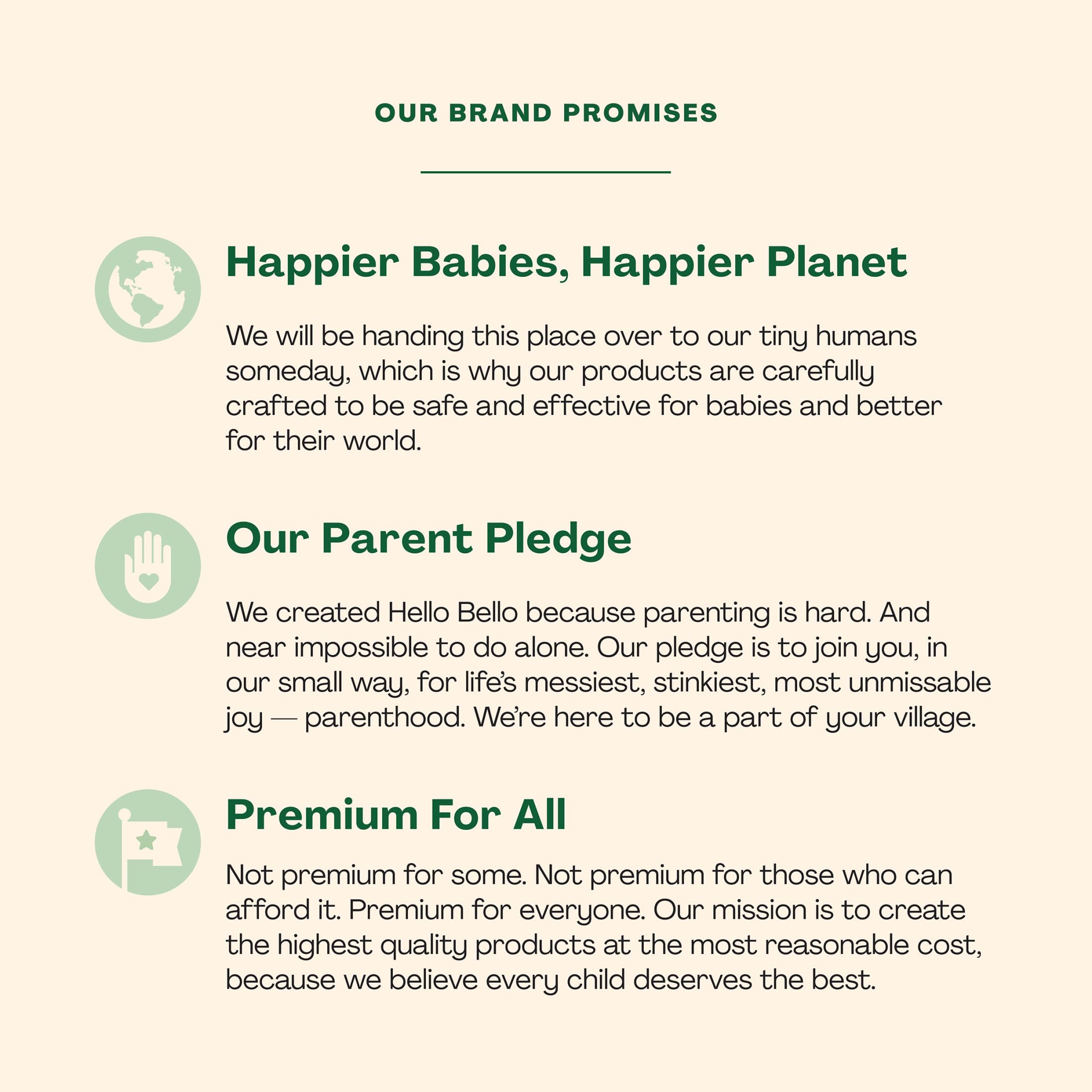 PREMIUM FOR ALL. Not premium for some. Not premium for those who can afford it. Premium for everyone. Our mission is to create the highest quality products at the most reasonable cost, because we believe every child (and family) deserves the best. Hello Bello believes in giving back and has donated over 6 million diapers (and a heckuva lot of wipes and care products) to parents in need.