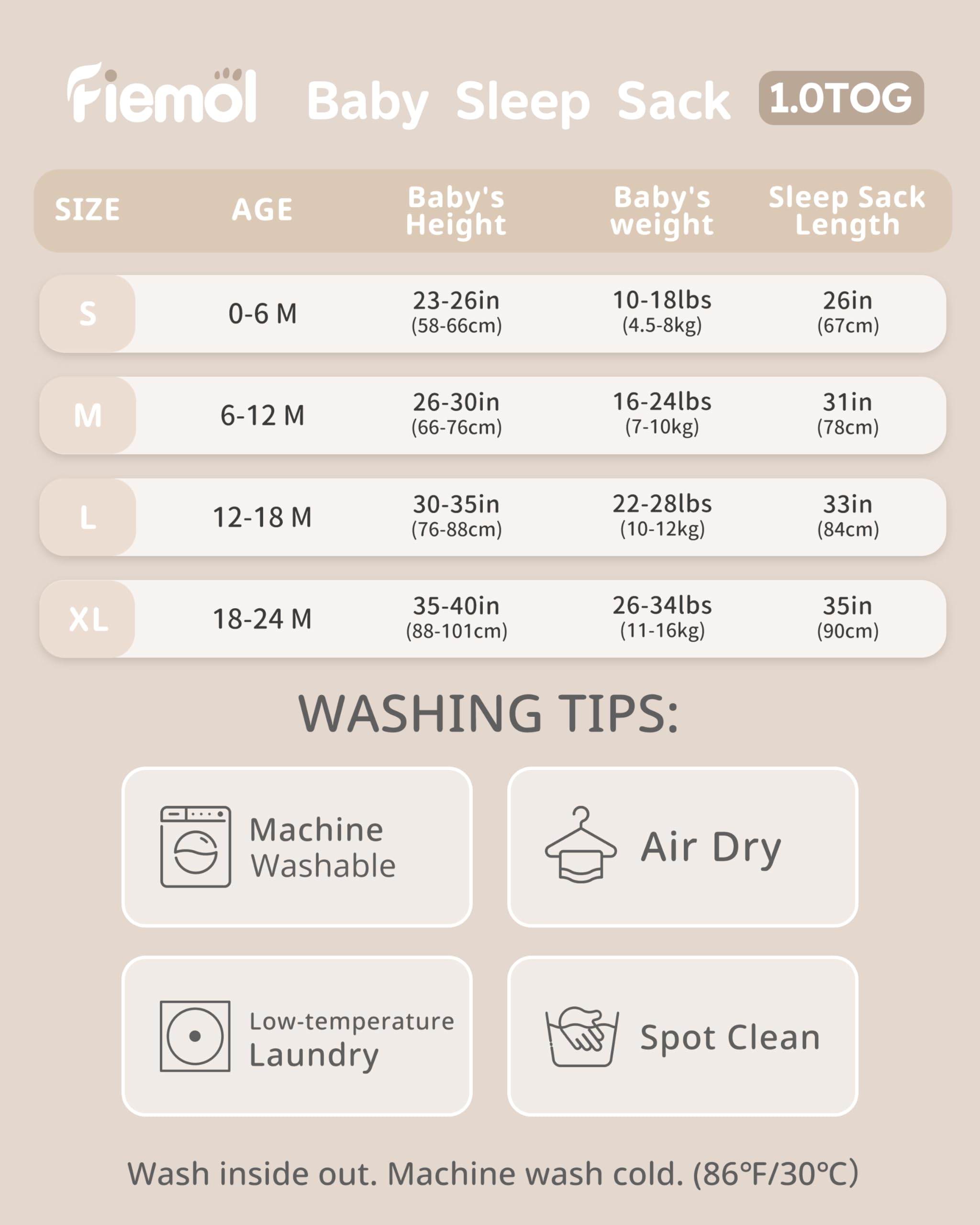Sizes for Baby's Growth: From newborn to toddler, we offer four sizes to accompany every stage for your little one: 0–3 months and 3–6 months (10-18 pounds), 6-12 months (16-24 pounds), 12-18 months (22-28 pounds), 18-24 months (26-34 pounds). The relaxed fit allows freedom of movement for active little ones. If you're between sizes, please choose the smaller one or see the size chart for a better fit. And machine wash gently in cold water (30°C / 86°F) to maintain softness.
