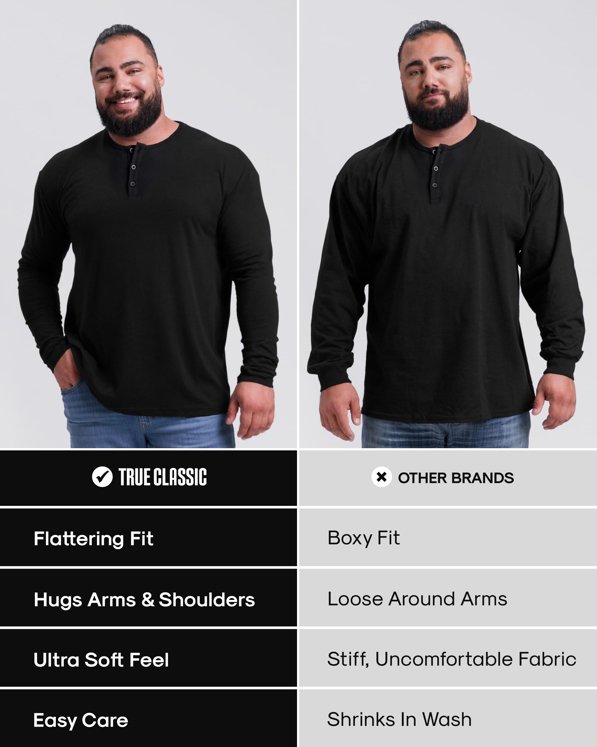 Description Meet the long sleeve men shirts lineup that fits perfect. The True Classic collection pairs a modern, athletic silhouette with soft, breathable fabrics that move easily and hold their shape. Our premium long sleeve crew and long sleeve Henley are crafted from a smooth 60/40 cotton-poly blend that layers effortlessly and stays comfortable all day. When the weather cools, reach for the waffle long sleeve crew—its brushed modal-cotton knit delivers extra warmth with the same easy stretch. Tag-free labels keep things itch-free, classic side seams maintain structure, and minimal shrinkage helps ensure that true-to-size fit wash after wash. Available in S–3XL and a range of versatile colors including the black long sleeve t shirt men love and the white long sleeve t shirt men need, each style is built for everyday wear—office, off-hours, and everything in between. Wash cold, dry low (up to 5% shrinkage), and you’re set. Slip on your favorite True Classic long sleeve and head out feeling comfortable, put-together, and ready for the day.