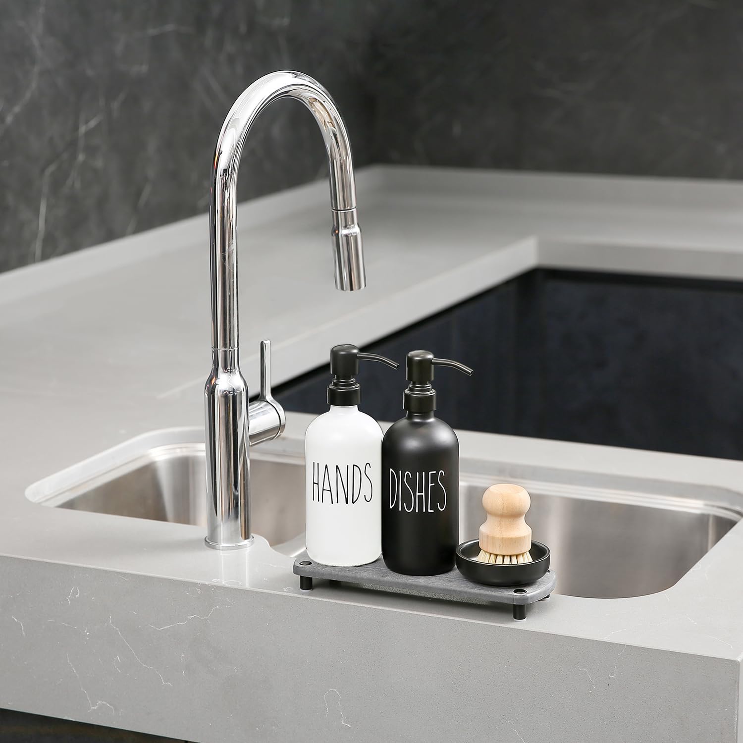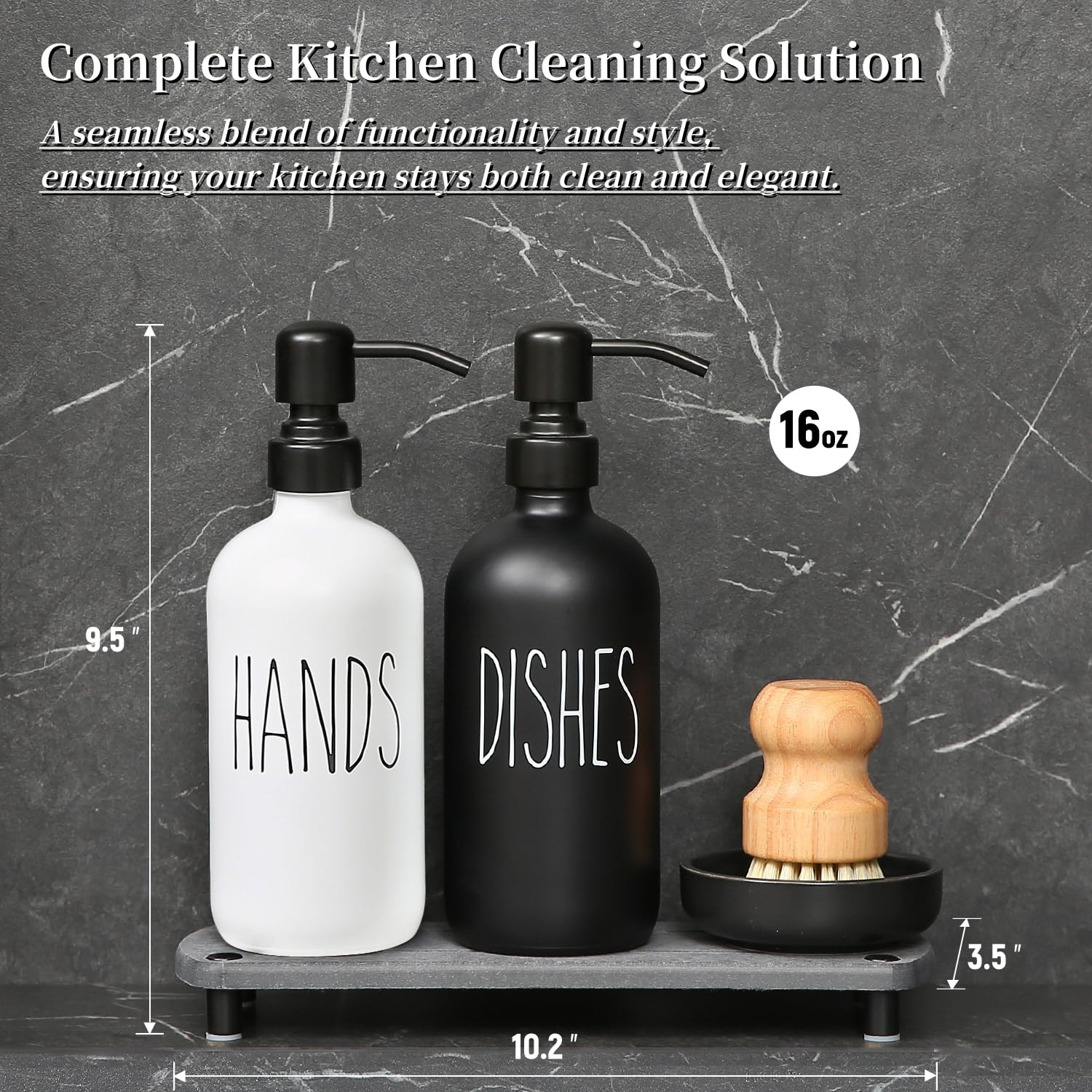 [Complete Kitchen Cleaning Solution] This set includes one dish soap bottle, one hand soap bottle, a kitchen dish brush, and a ceramic brush holder, all neatly arranged on a stone drying tray.