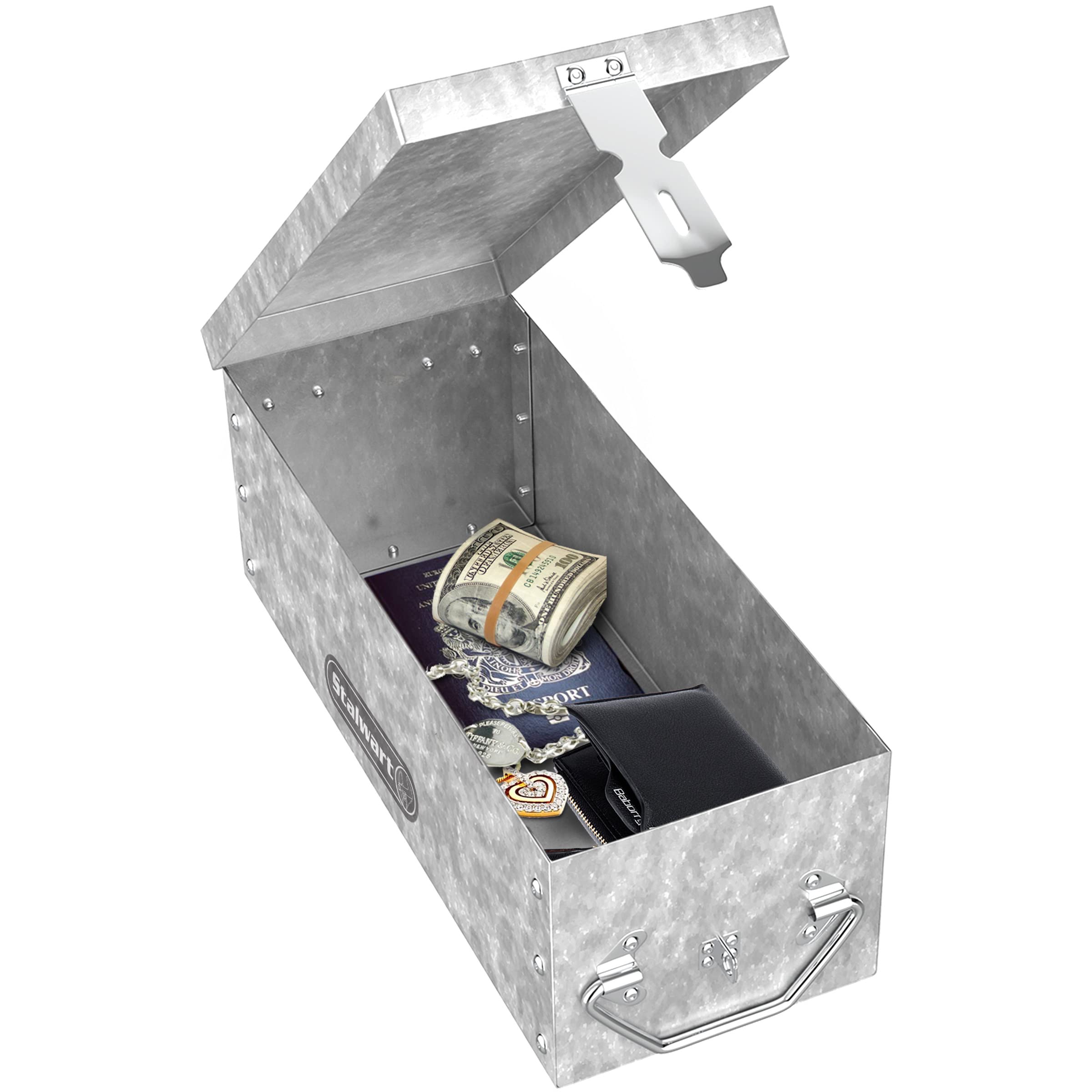 Keep valuables safe and sound in your home, office, or vehicles by placing belongings inside this Metal Lock Box by Stalwart. Ideal for loose cash, jewelry, and heirlooms, this small safe also works well for stashing prescription medication, weapons, and ammunition thanks to a spacious 228-cubic-inch interior and hasp on the front for attaching your own padlock (not included). Use the handle on the front to easily move this lockable cash box when fully loaded to your secret dorm storage spot or placement on closet shelves.