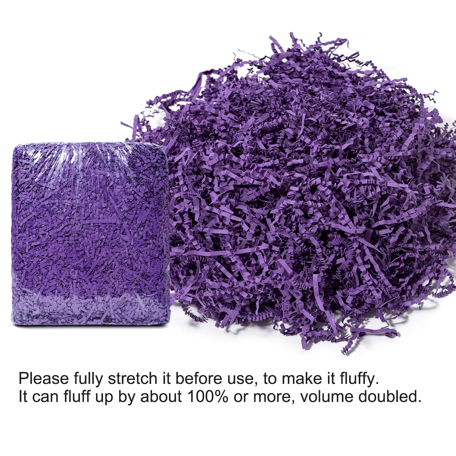 Crinkle Cut Paper Shred Filler: Pack of 1/2 LB (8oz), purple color. Made of 54 lb (80 gsm) paper, recycled and eco friendly.